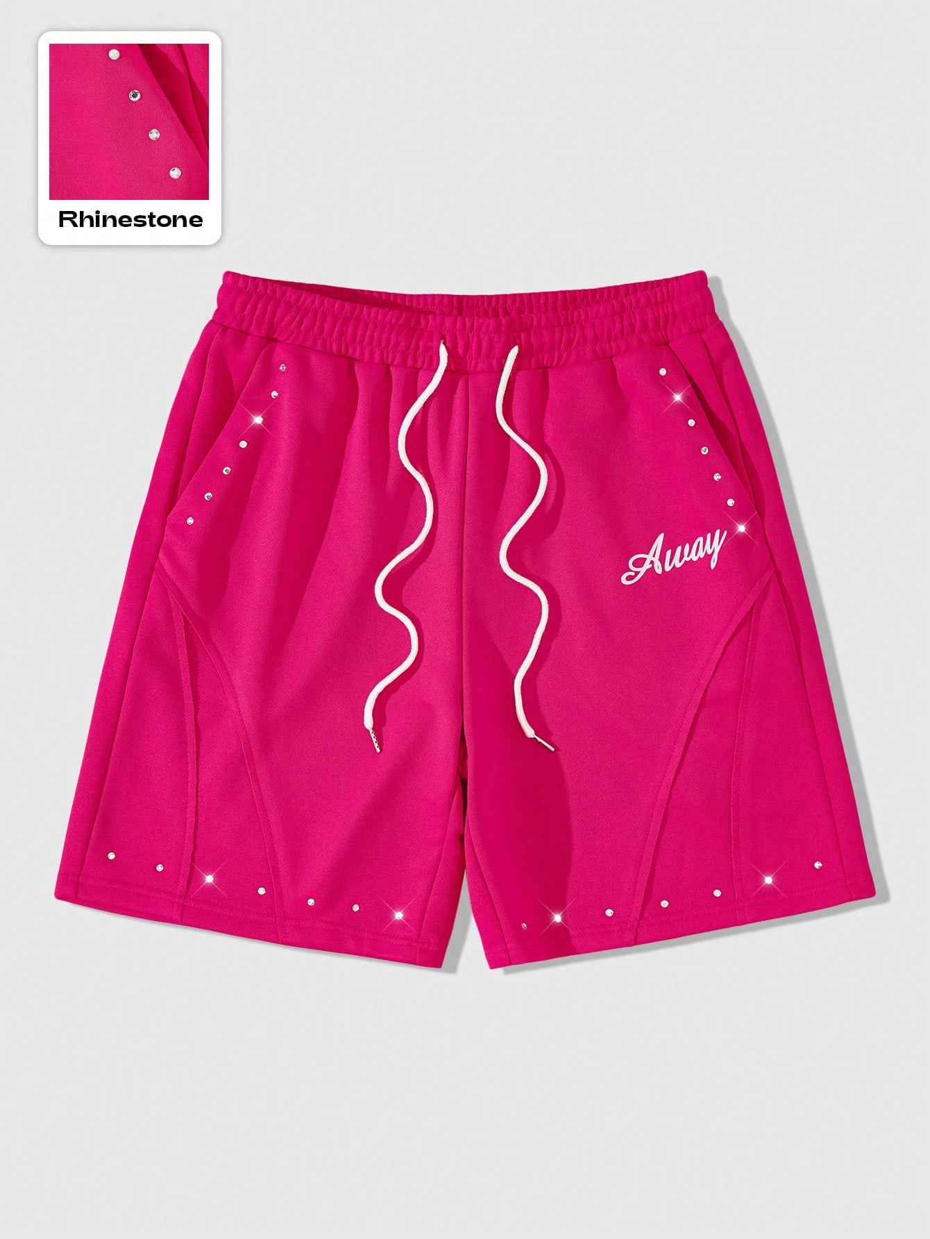 Street Life Men's Letter Print Drawstring Waist Sparkly Diamond Patchwork Loose Shorts