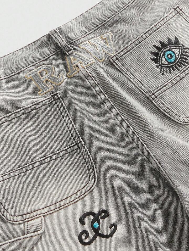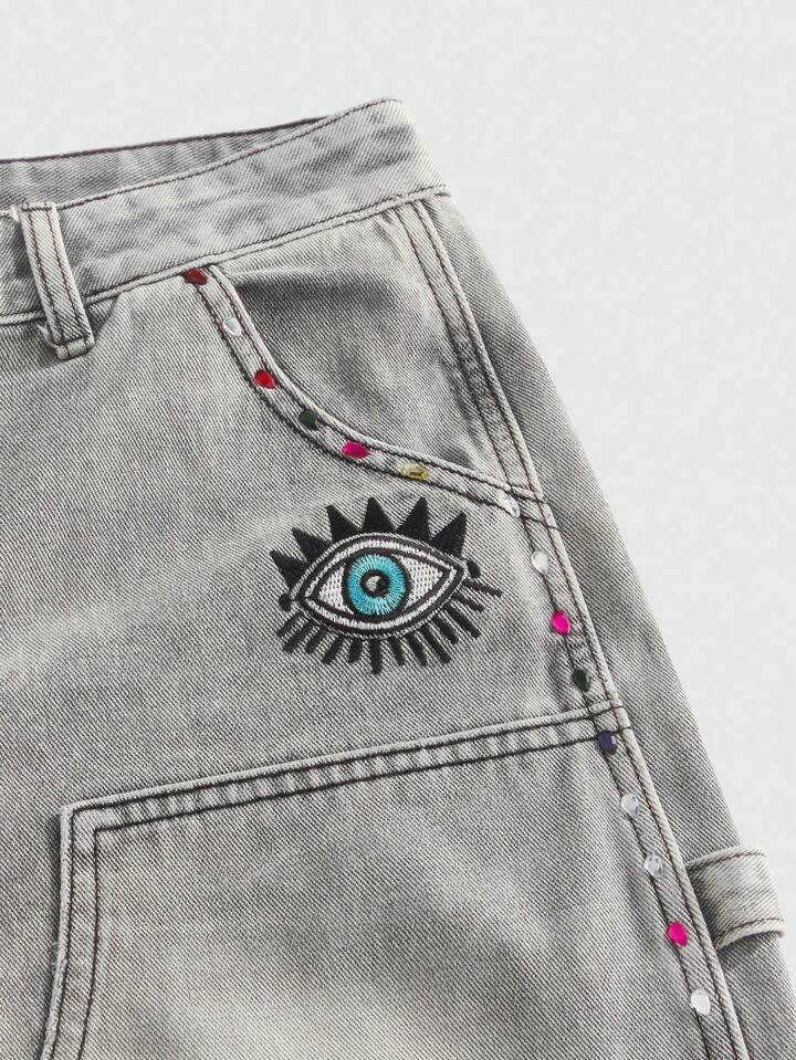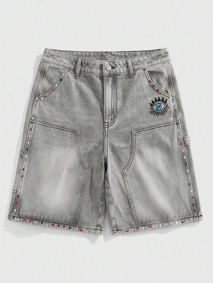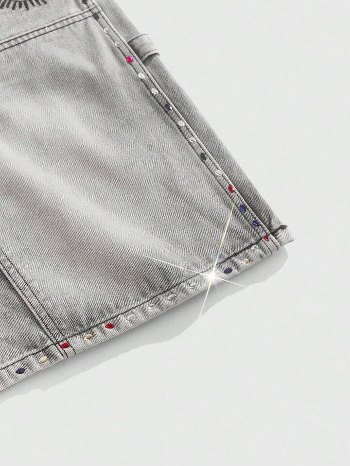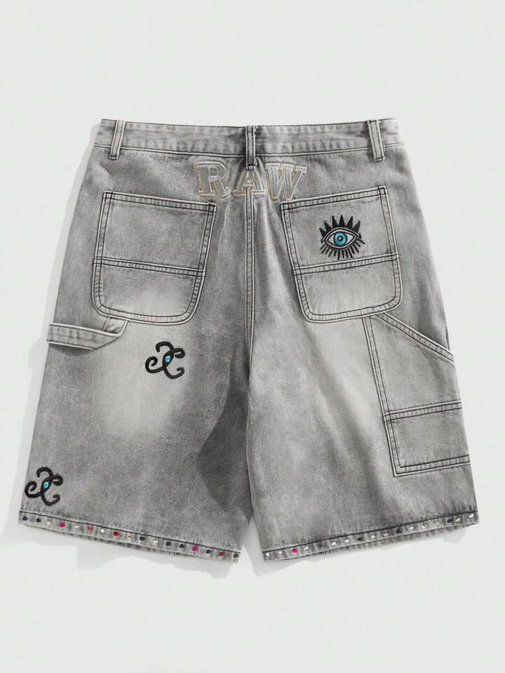 Street Life Men's Sparkling Diamond Embroidered Pattern Cargo Denim Shorts