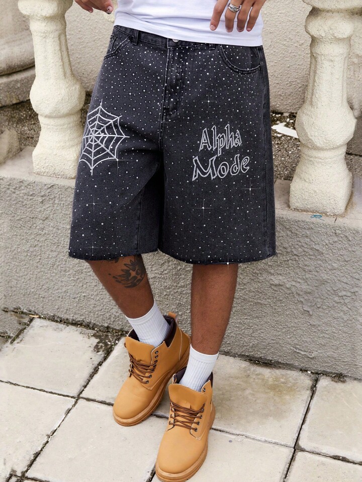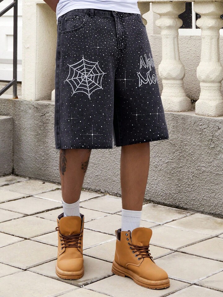 Street Life Men's Spider Rhinestone Graphic Pocket Wide Leg Loose Casual Denim Shorts