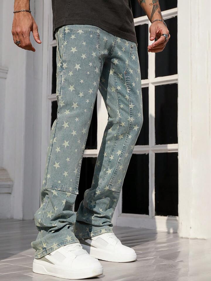 Street Life Men's Star Pattern Layered Skinny Fit Flared Leg Jeans, Streetwear Style