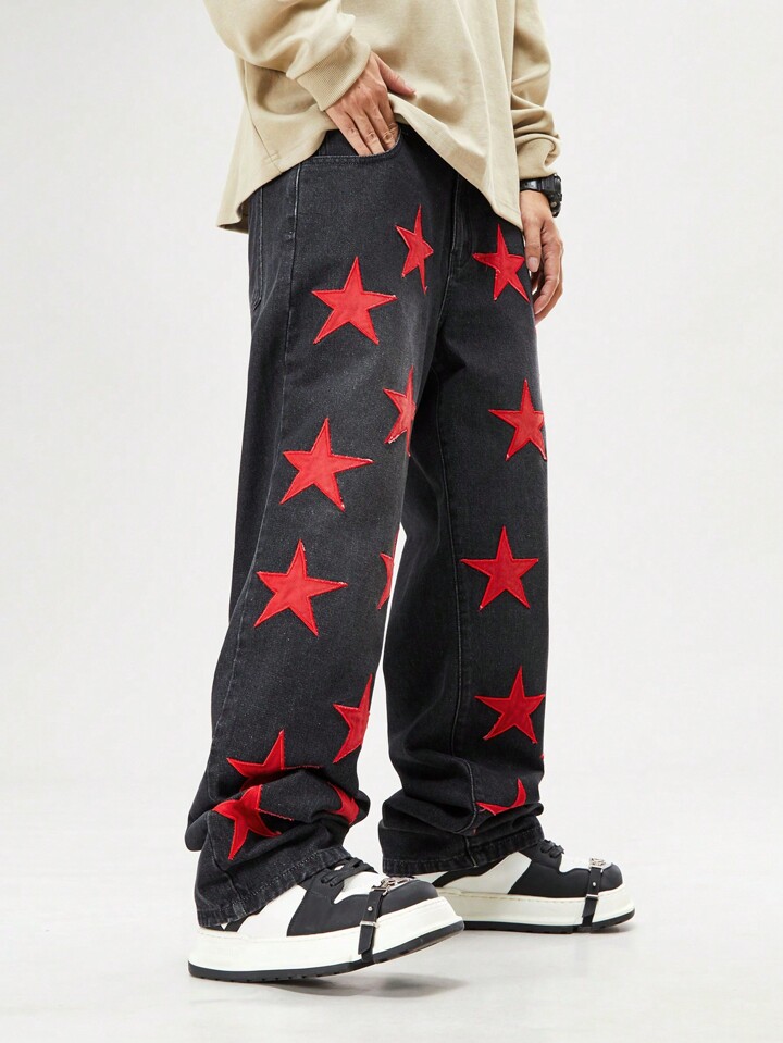 Street Life Men's Star Print Patch Pockets Wide Leg Loose Casual Jeans