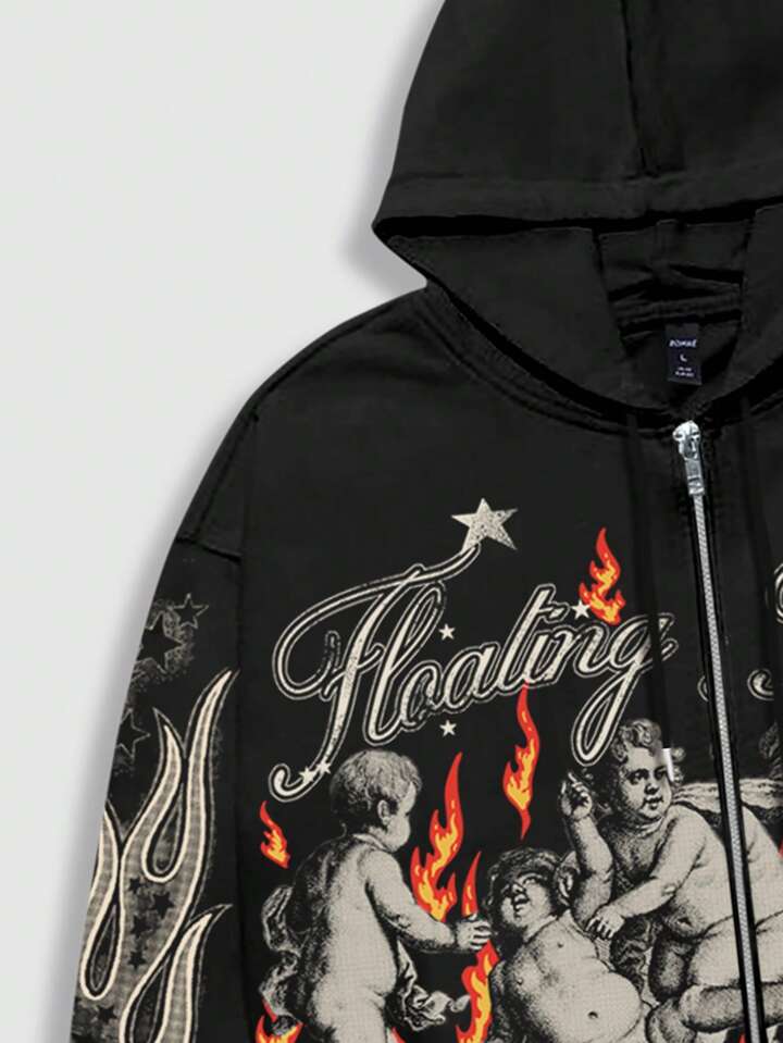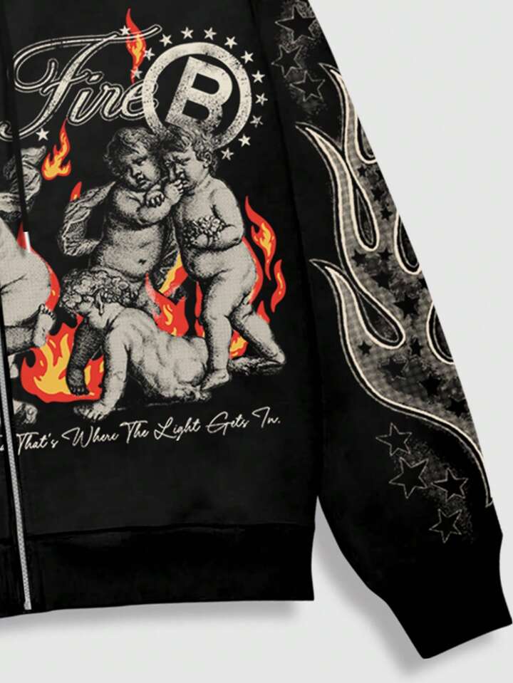 Street Life Men's Street-Style Graphic Letter & Figure Print Zipper Hoodie, For Fall Winter