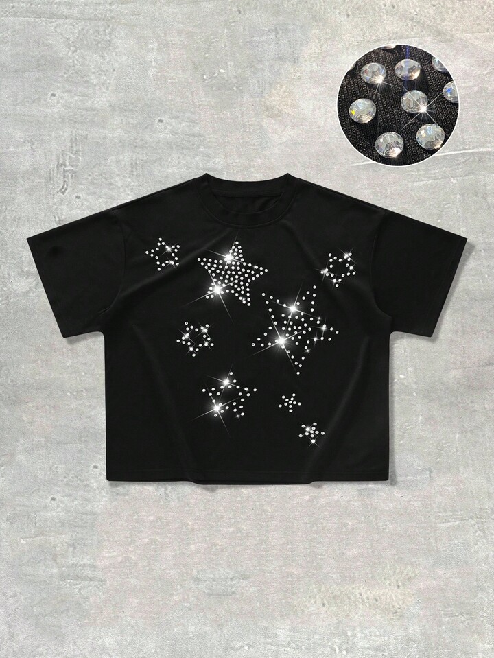 Street Life Men's Summer Rhinestone Five-Pointed Star Pattern Round Neck Short Sleeve Casual T-Shirt, 2000s Style