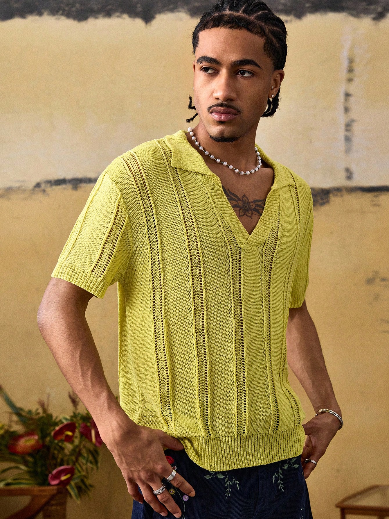 Street Life Men's Turndown Collar Short Sleeve Casual Loose Knit Jacquard Top