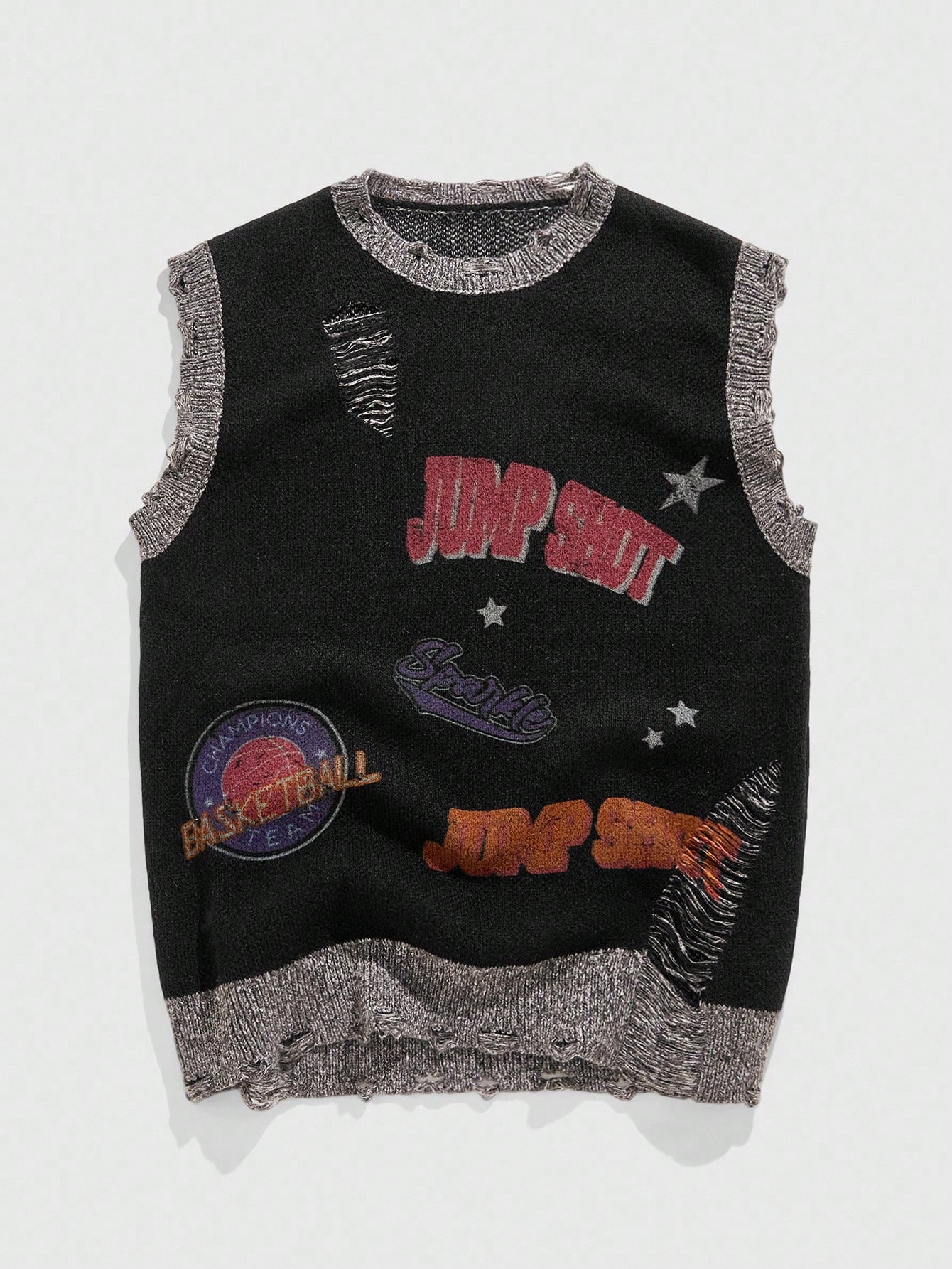 Street Life Men's Vintage Letter Pattern Distressed Knit Sweater Vest, Autumn