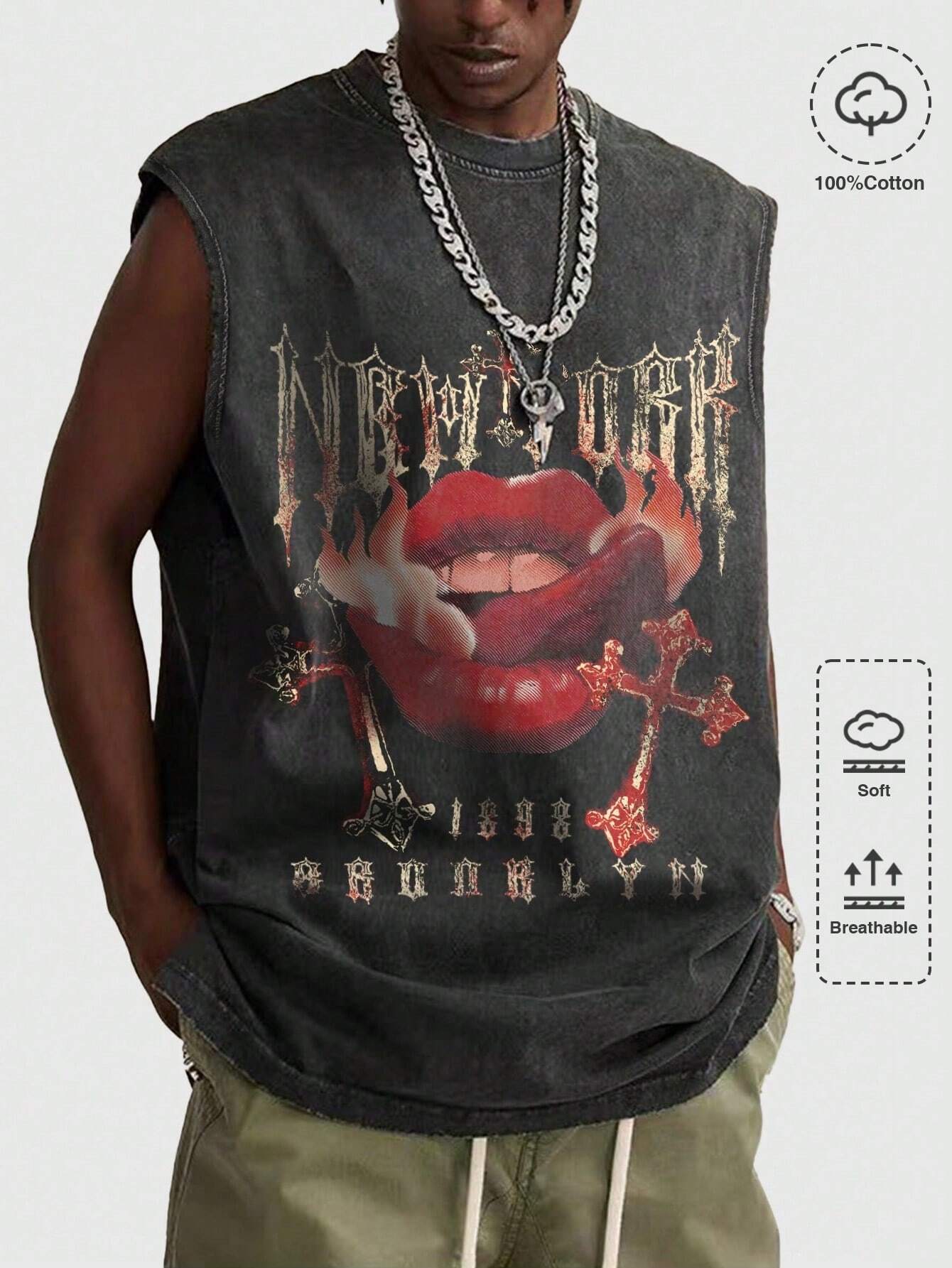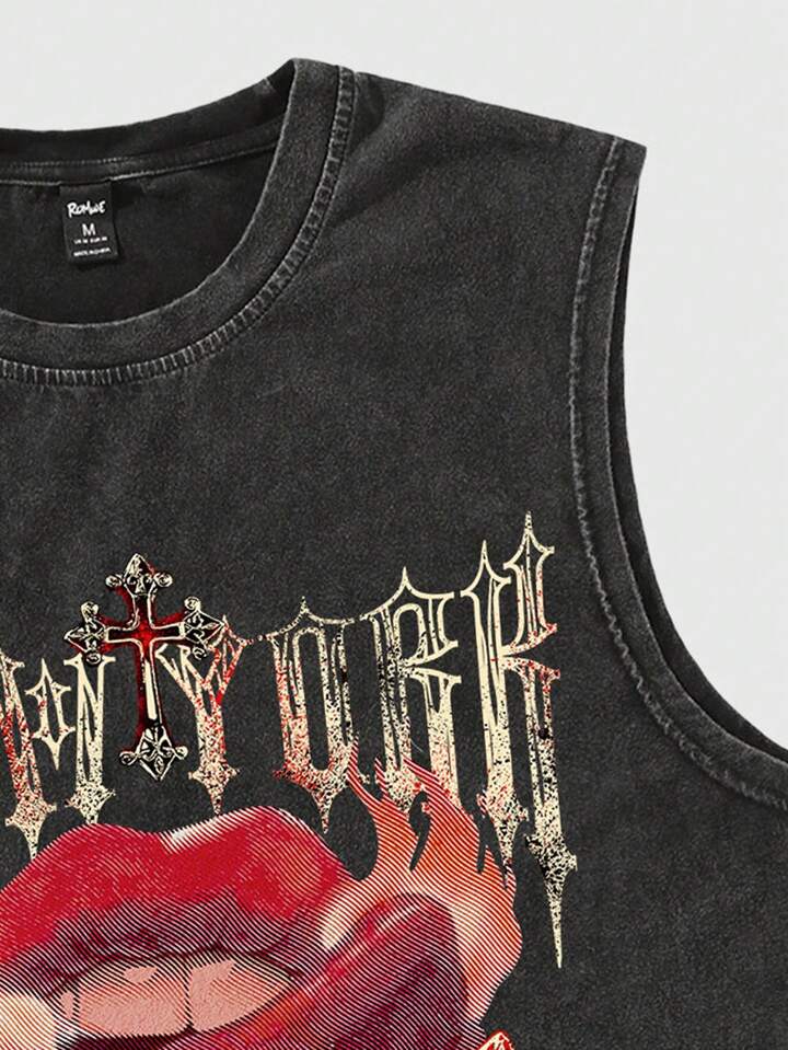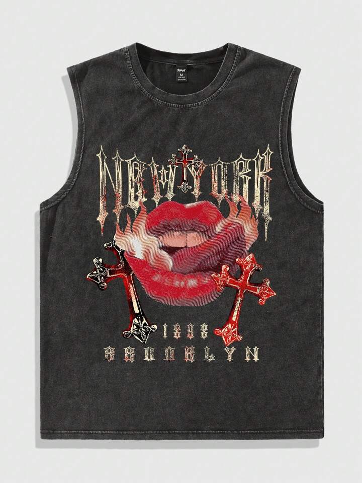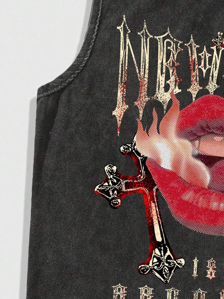 Street Life Men's Vintage Lip And Cross Printed Washed Tank Top, Summer For Halloween, School