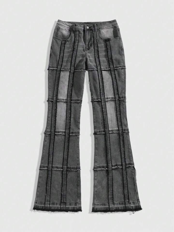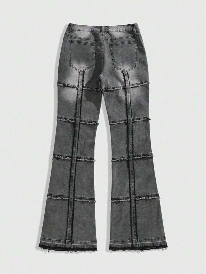 Street Life Men's Washed Patchwork Layered Skinny Fit Flared Jeans, Streetwear Style