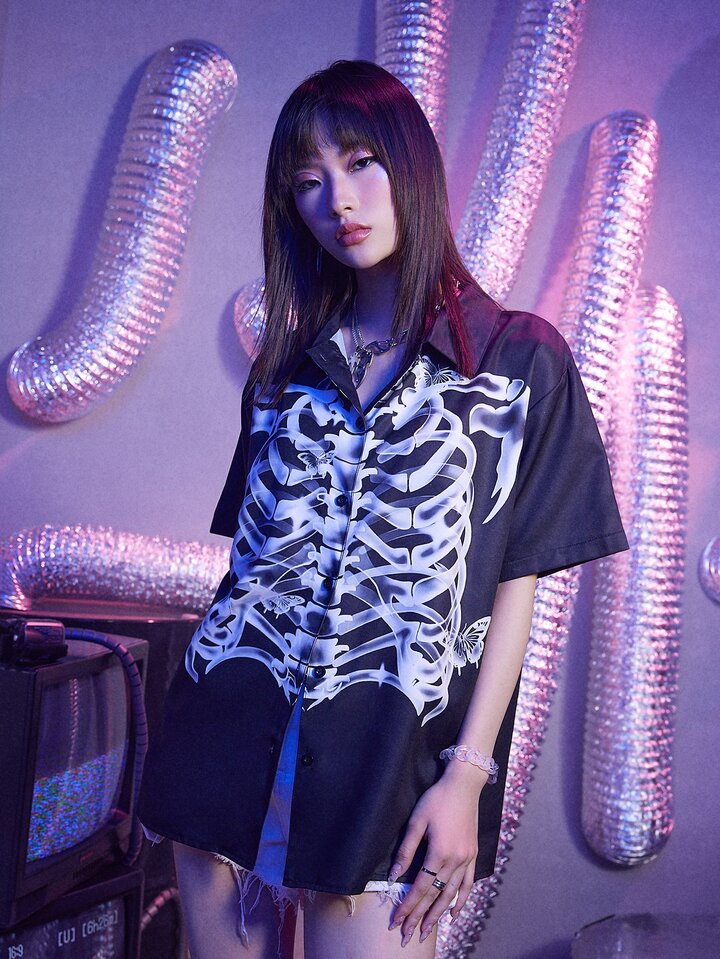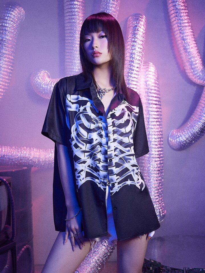 Street Life Skeleton Print Button Front Shirt