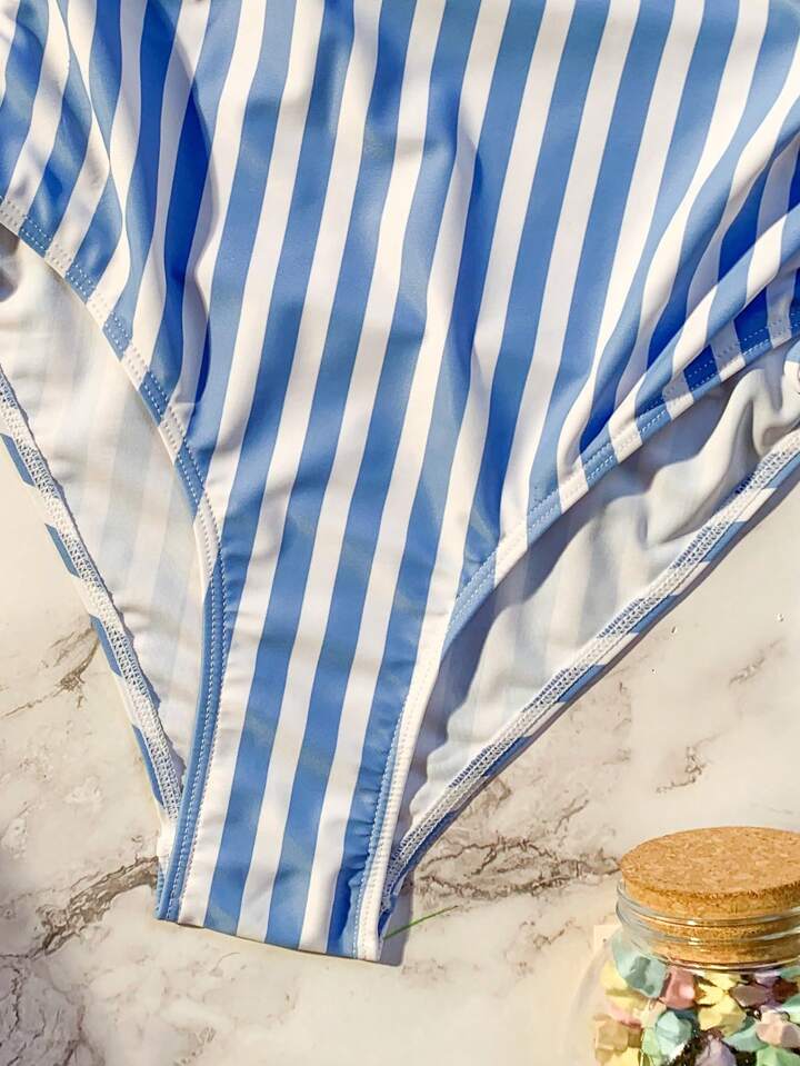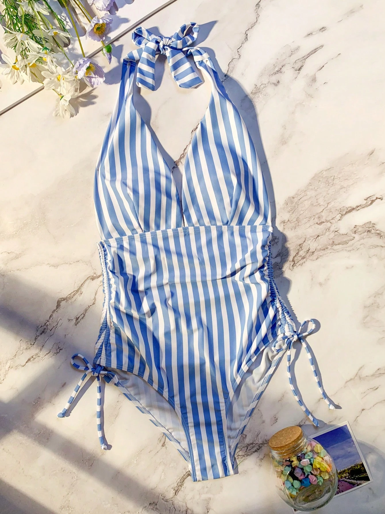 Striped Drawstring Side Halter One Piece Swimsuit, For Summer Beach Vacation
