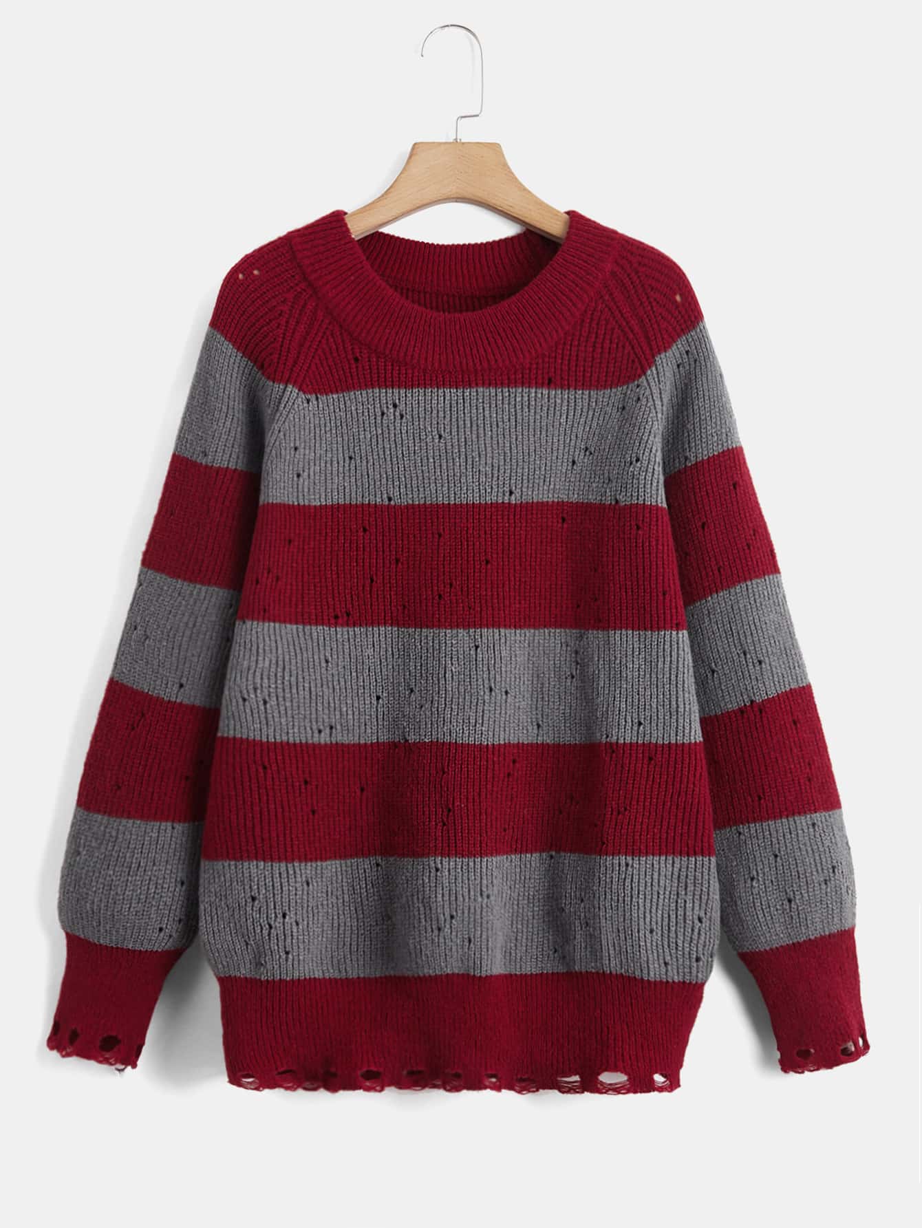 Striped Pattern Raglan Sleeve Distressed Sweater