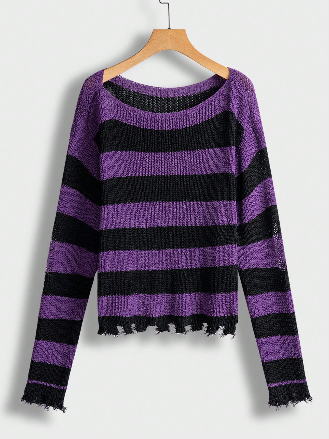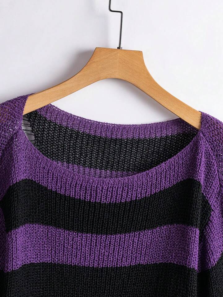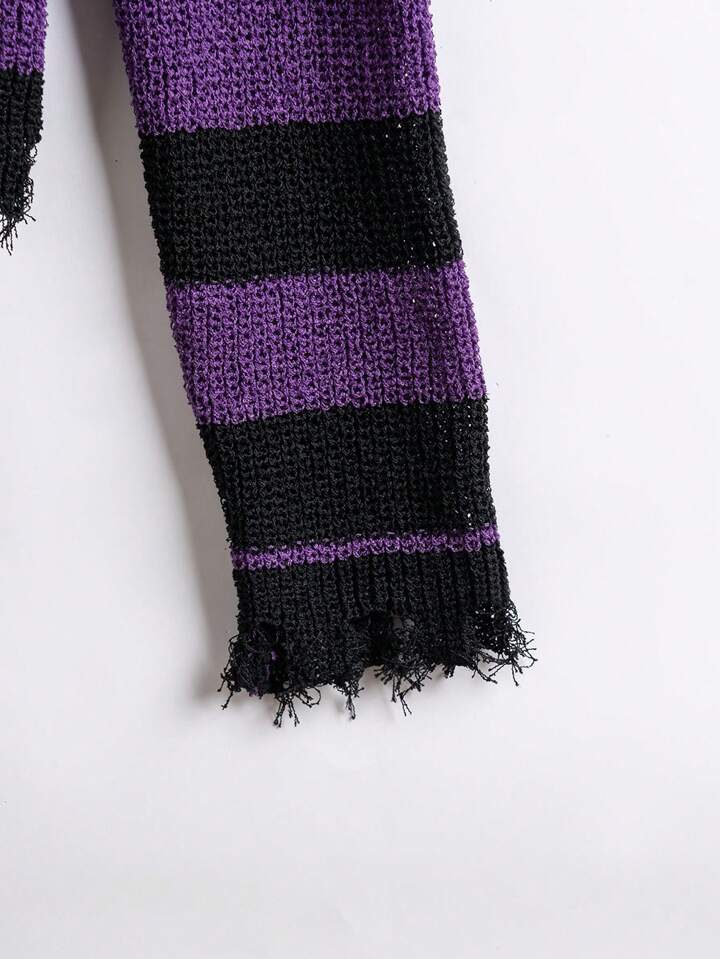Striped Pattern Ripped Drop Shoulder Sweater