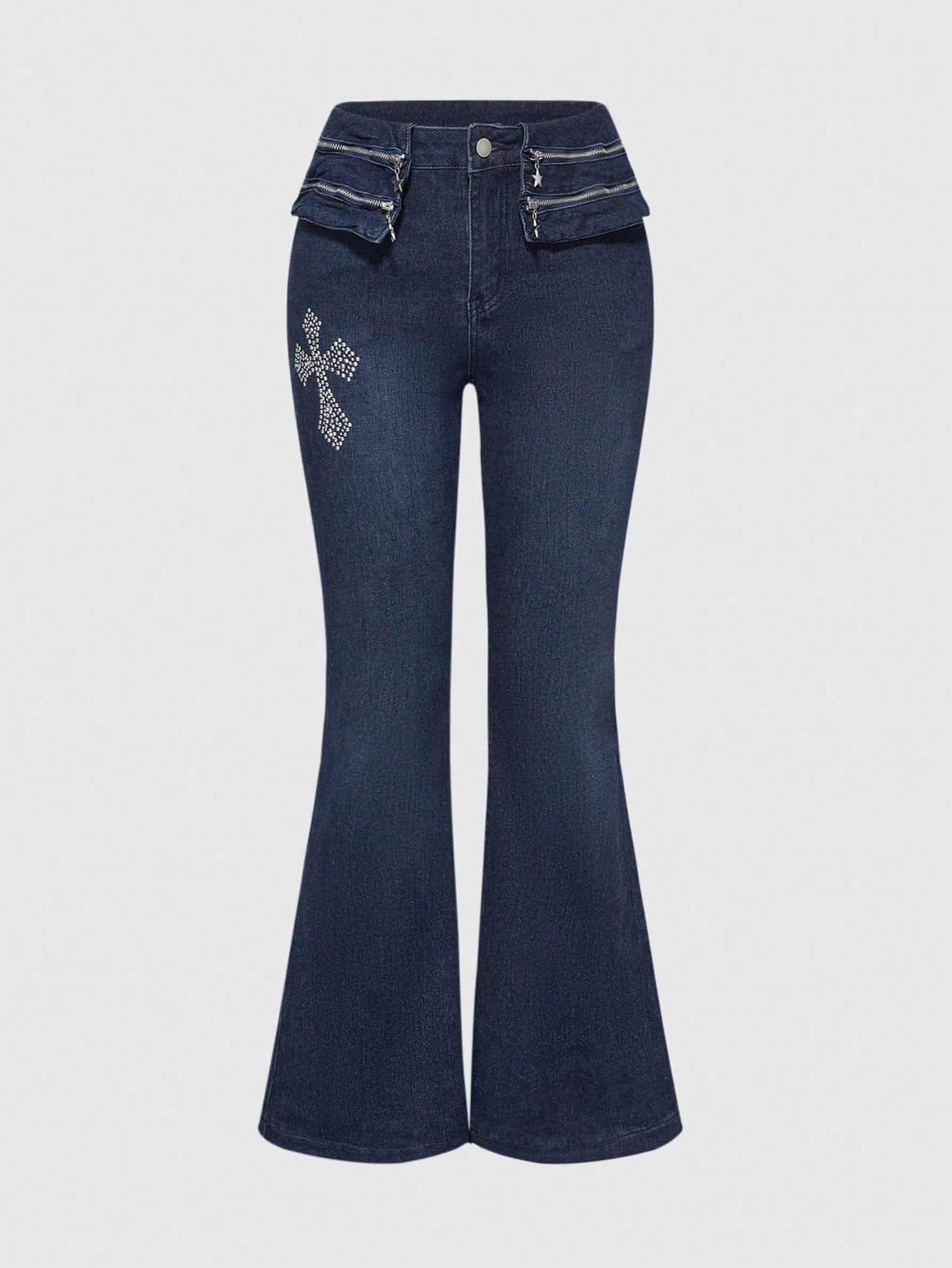 Grunge Punk Subculture Y2K Retro Fitted Flared Knee Length Jeans With Cross Studs & Pentagram Patch, For Women