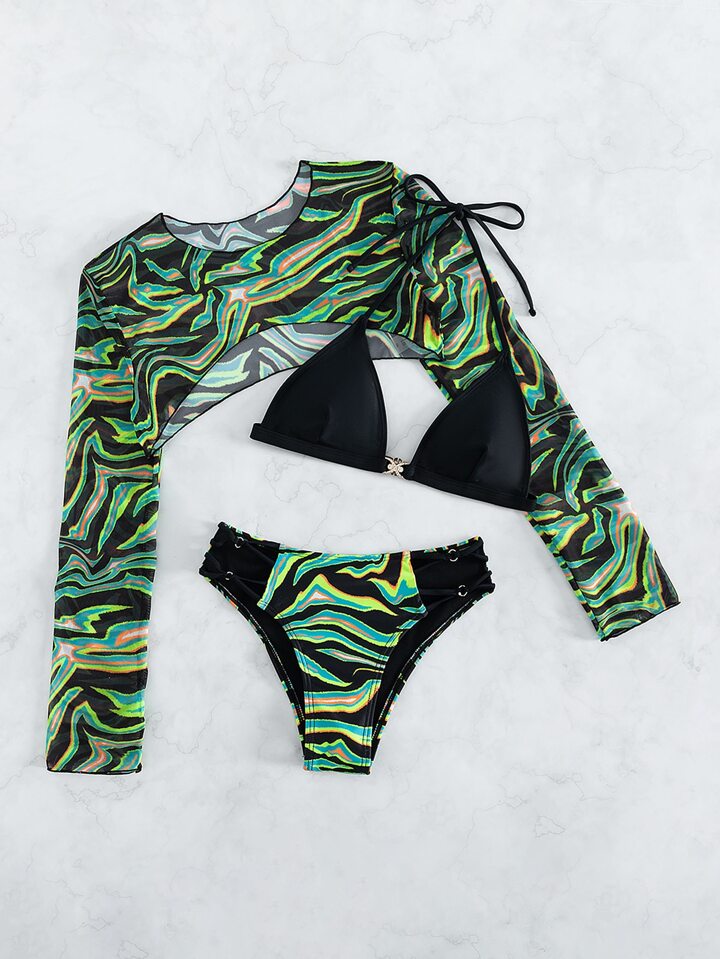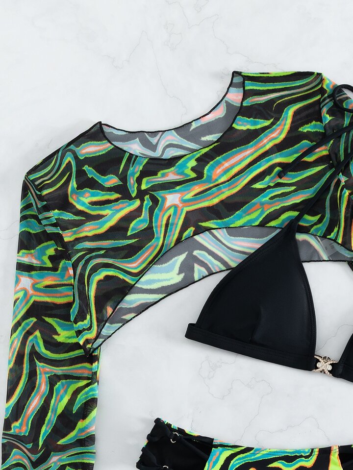 Summer Beach Marbled Print Bikini Set Halter Triangle Bra & Cutout Waist Bottom & Long Sleeve Super Crop Cover Up Top 3 Pieces Bikini