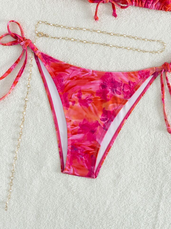 Summer Beach Tie Dye Bikini Set Triangle Knot Front Bra & Tie Side Bottom & Chain 3 Piece Bathing Suit