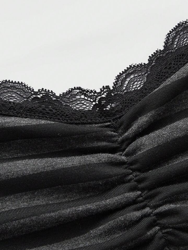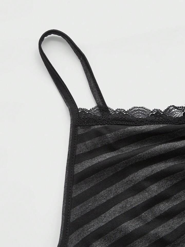 Summer Casual Versatile Black & Gray Striped Lace Trim Camisole
