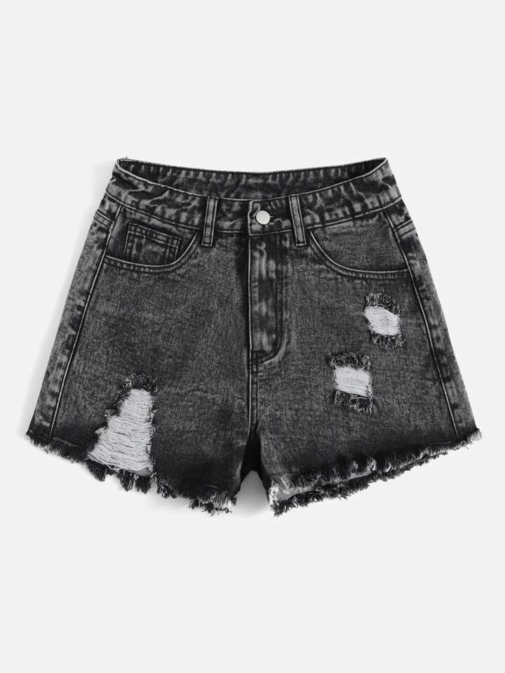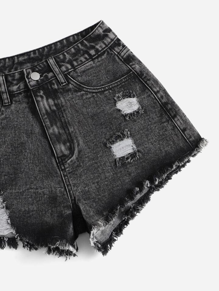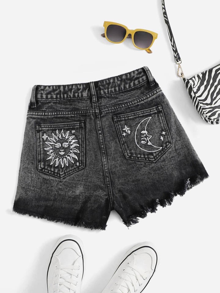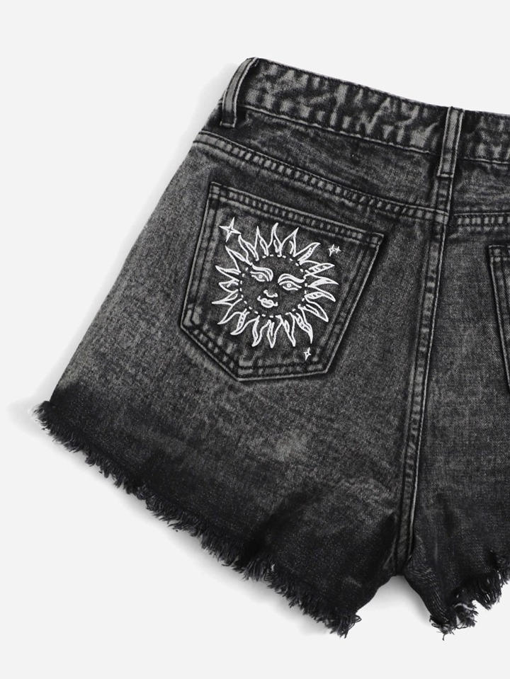 Sun & Moon Print Ripped Raw Cut Denim Shorts