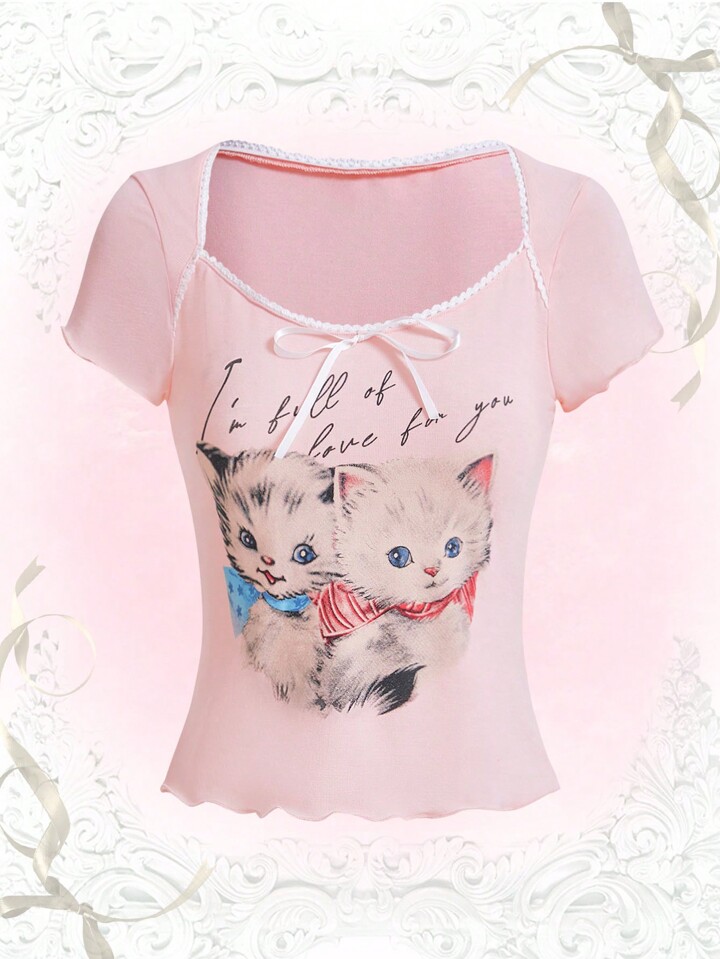 Sweetness Cat & Slogan Graphic Lettuce Trim Tee