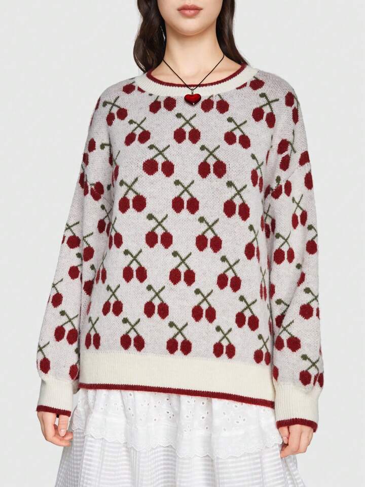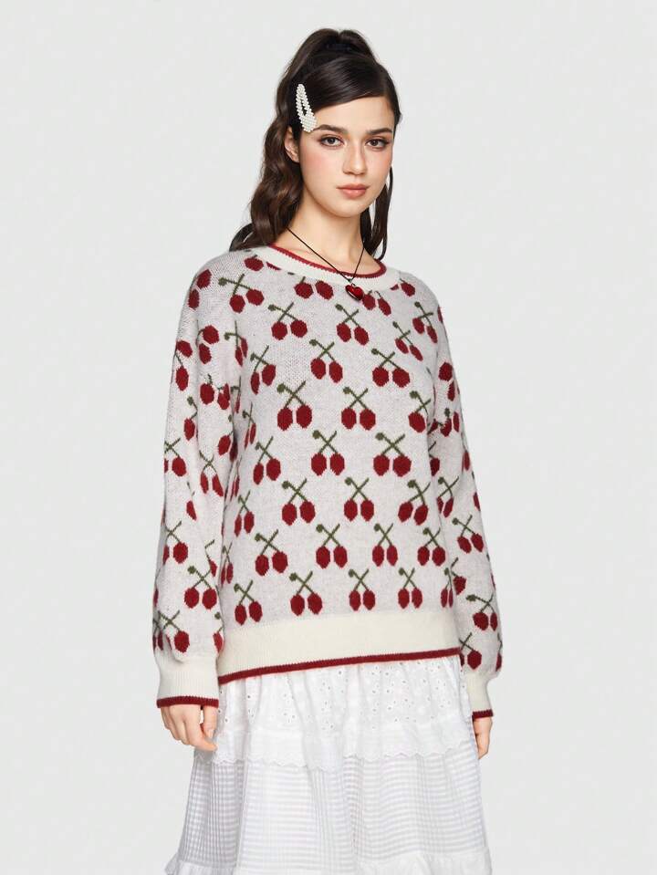 Sweetness Cherry Pattern Drop Shoulder Sweater