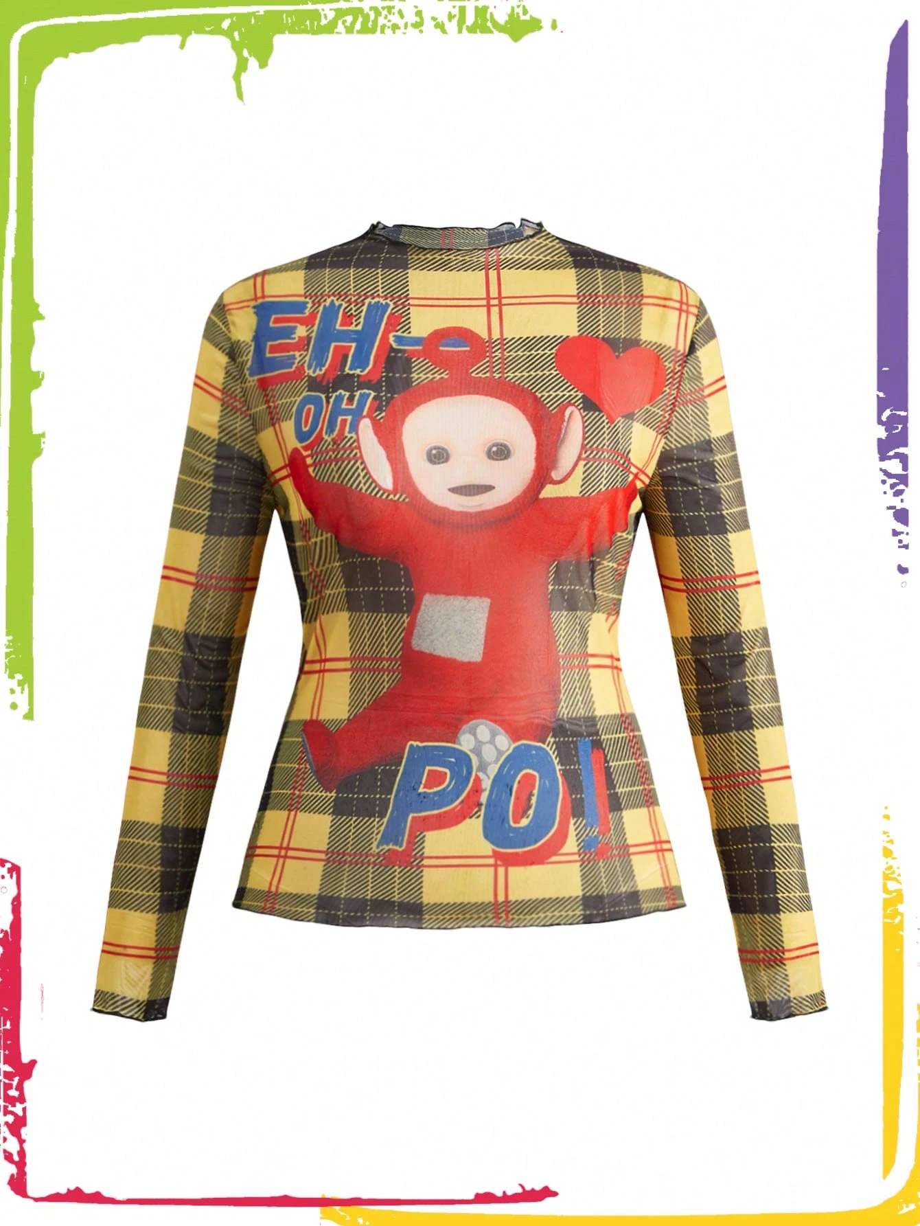 Teletubbies X ROMWE Plus Size Plaid Cartoon Pattern Long Sleeve Mesh Top, Autumn