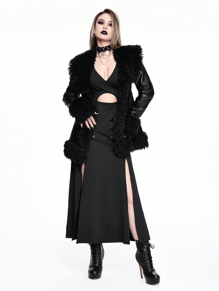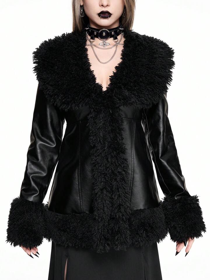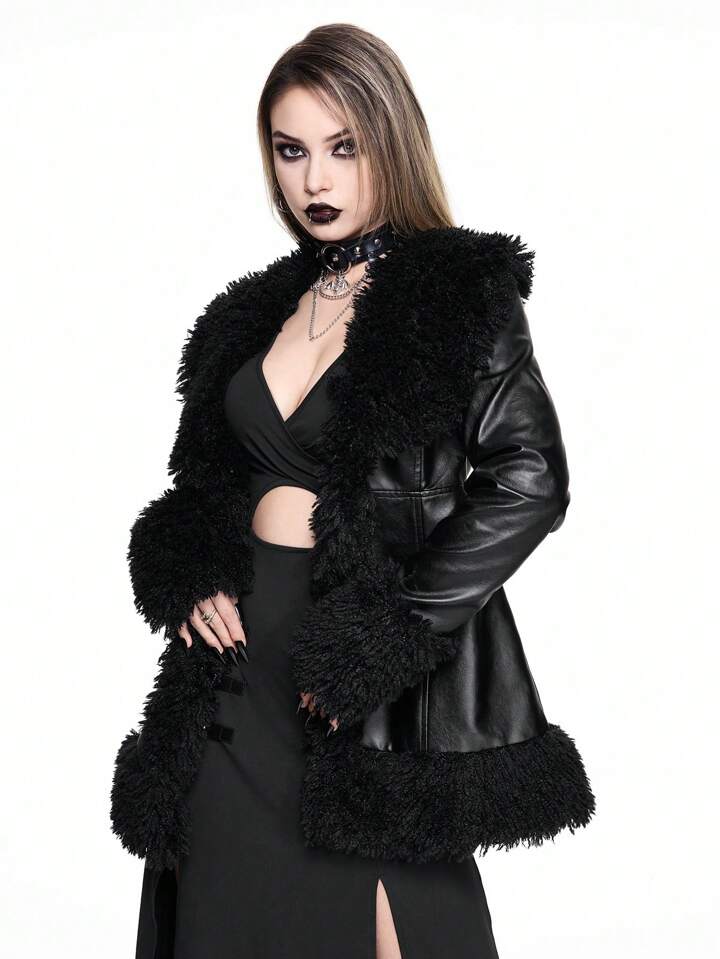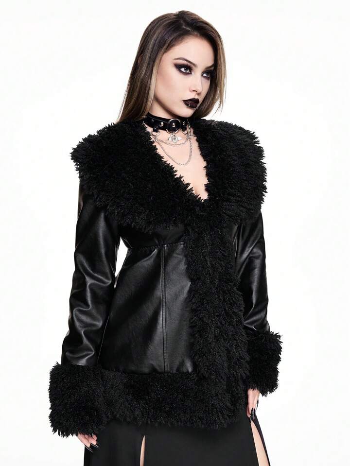 Thanksgiving Women Outfit: Vintage Gothic Shiny Leather Patchwork Furry Fitted Jacket
