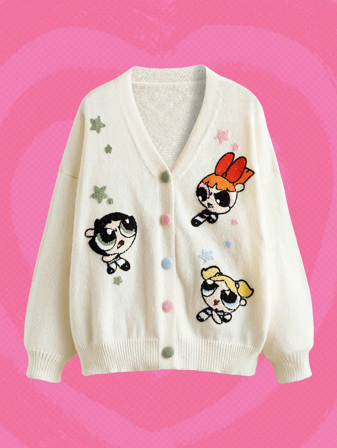 The Powerpuff Girls | ROMWE Cartoon Pattern Drop Shoulder Button Front Cardigan
