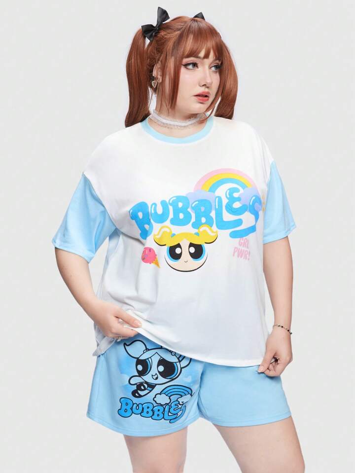 The Powerpuff Girls | ROMWE Plus Cartoon & Letter Graphic Drop Shoulder Tee