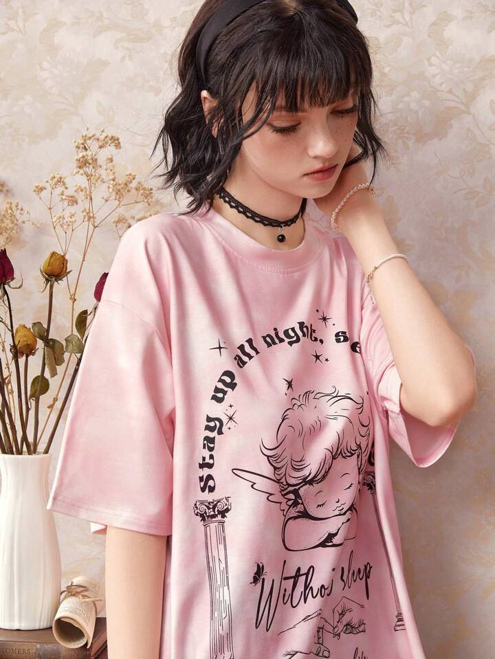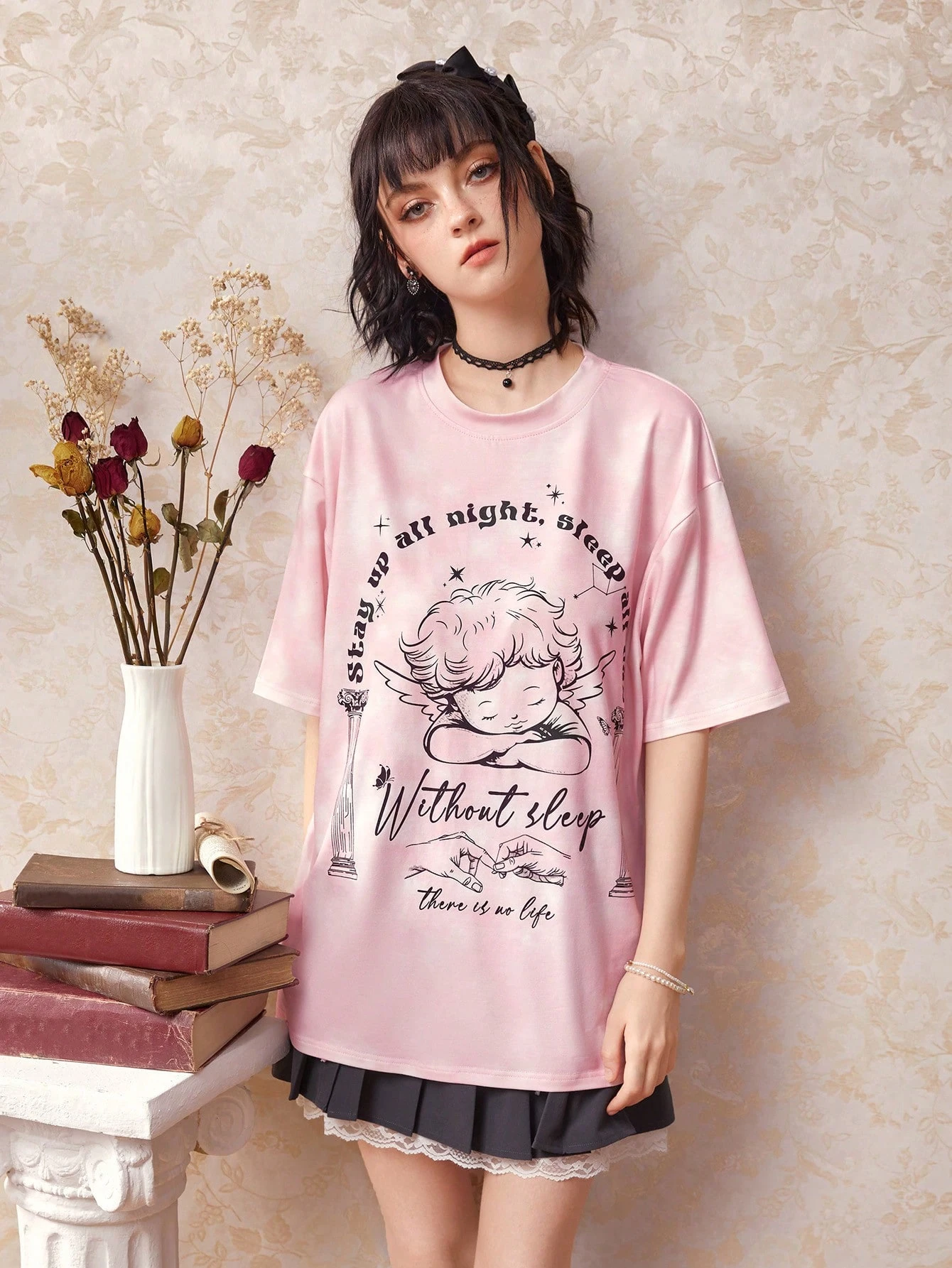 Tie Dye Slogan Angel Graphic Drop Shoulder Tee