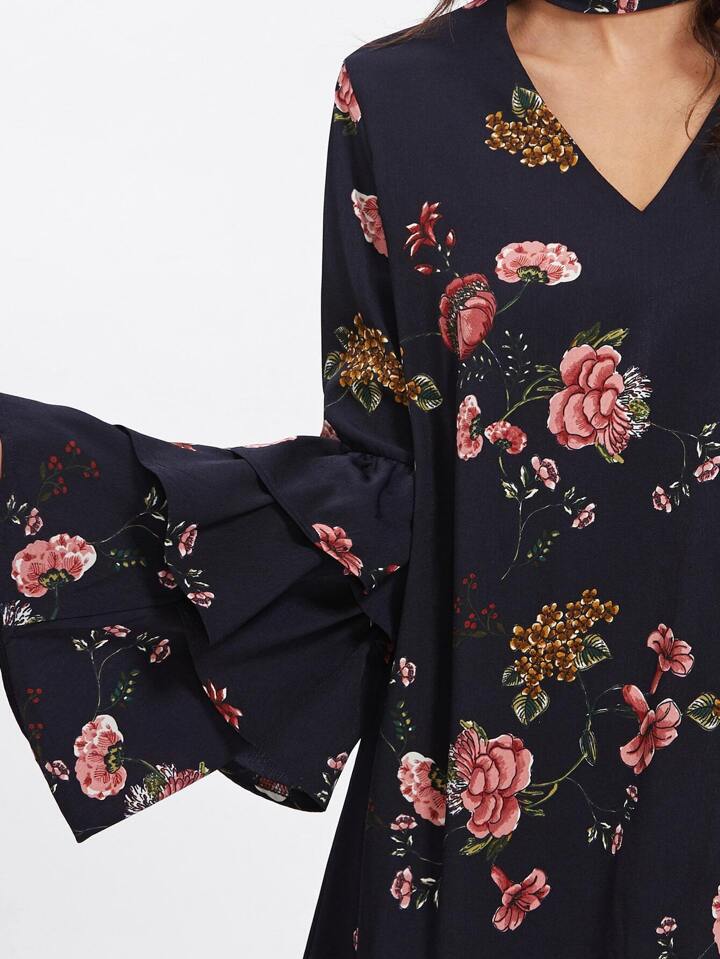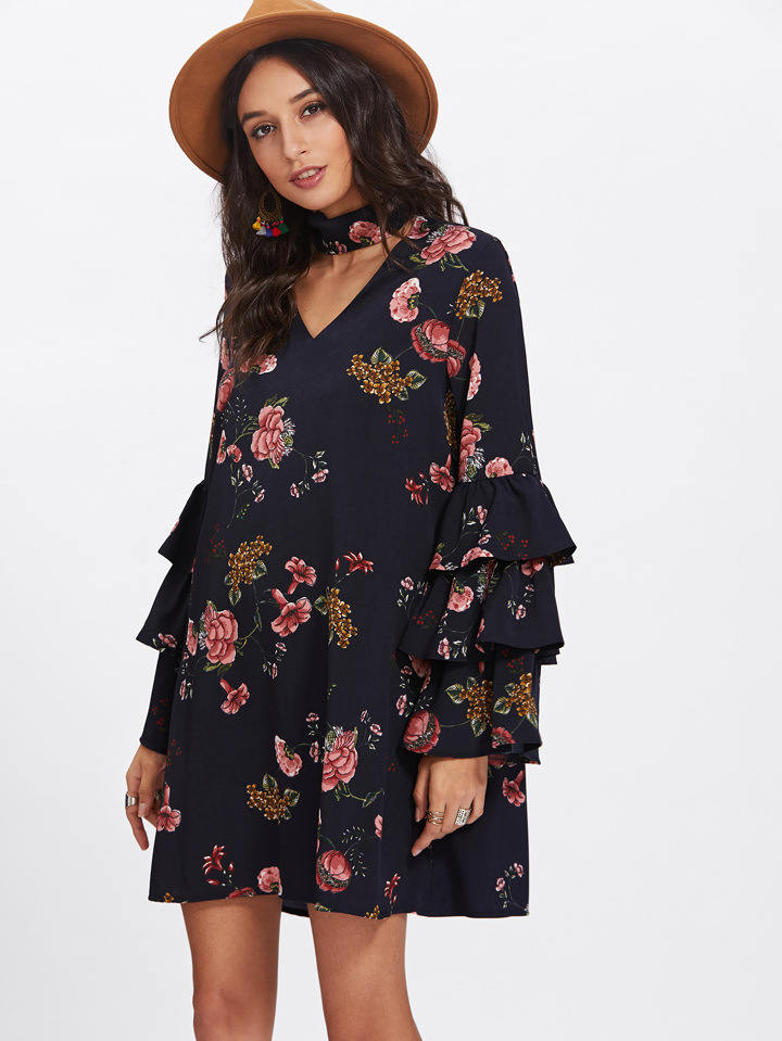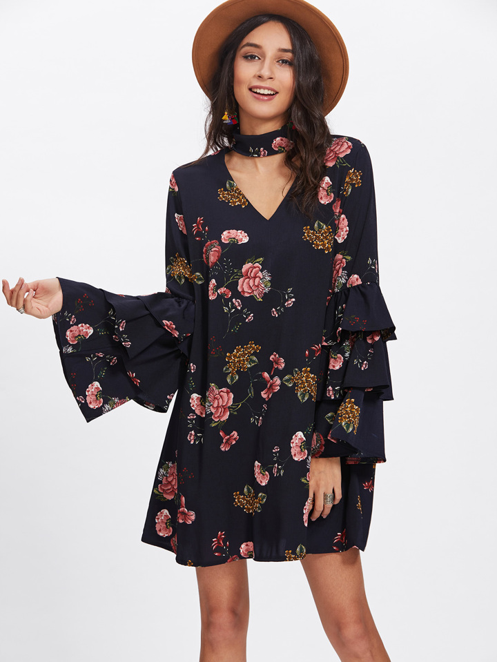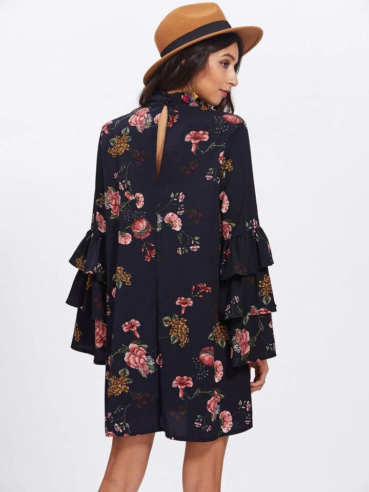 Tiered Bell Sleeve Choker Neck Swing Dress