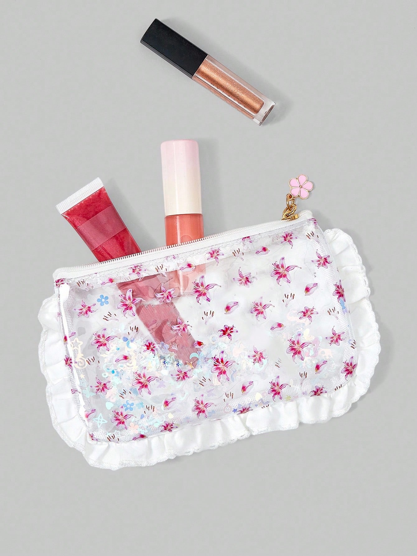 Fairycore Transparent PVC Sequin White Lace All-Over Red Flower Pattern Cosmetic Makeup Bag, Small Handy Size Storage Box