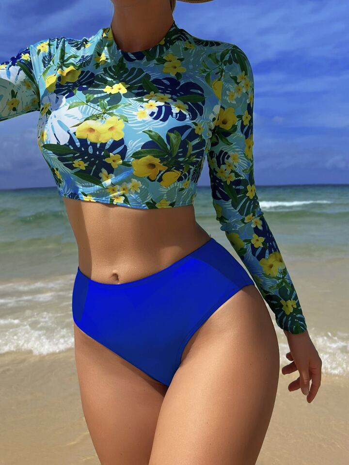 Tropical Print High Neck High Waisted Bikini Set With Long Sleeve Swim Shirt Summer Beach