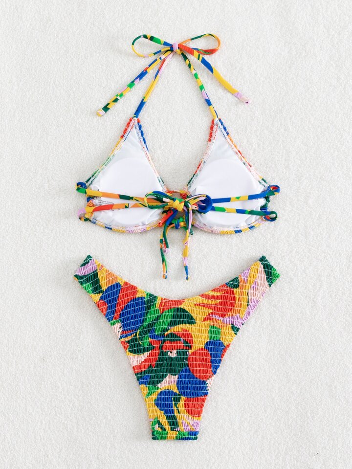 Tropical Print Smocked Drawstring Halter Summer Beach Bikini Set
