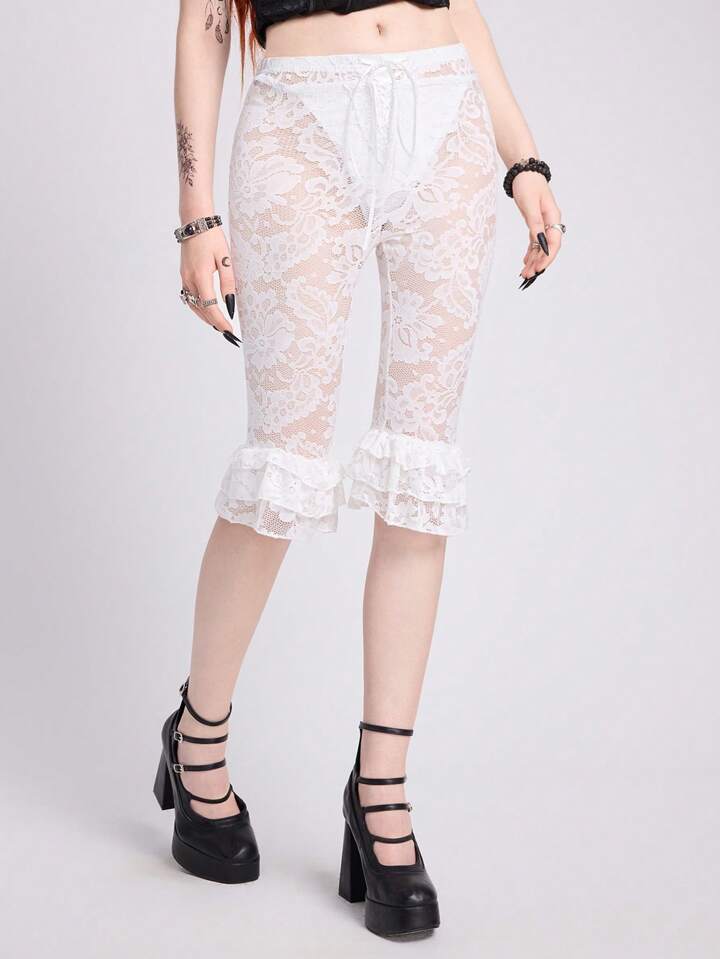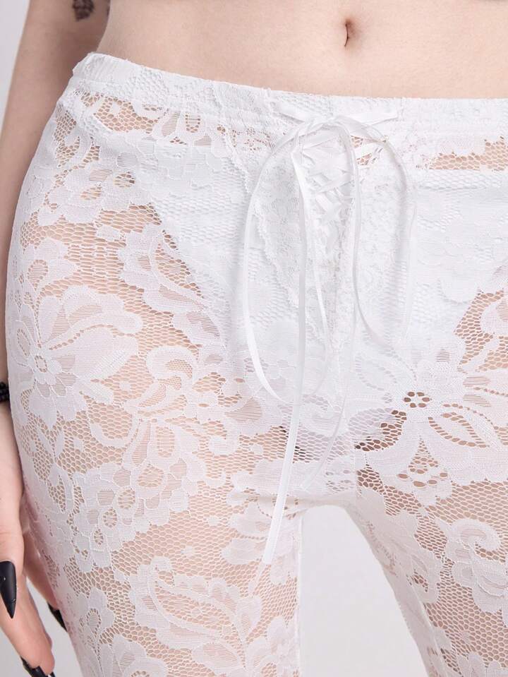 Vacation , Beach, Valentine's Day, Gothic Black Nature Style, Spring For Women, Sheer Lace Up Bowknot Elastic Multi-Layer Women's Leggings