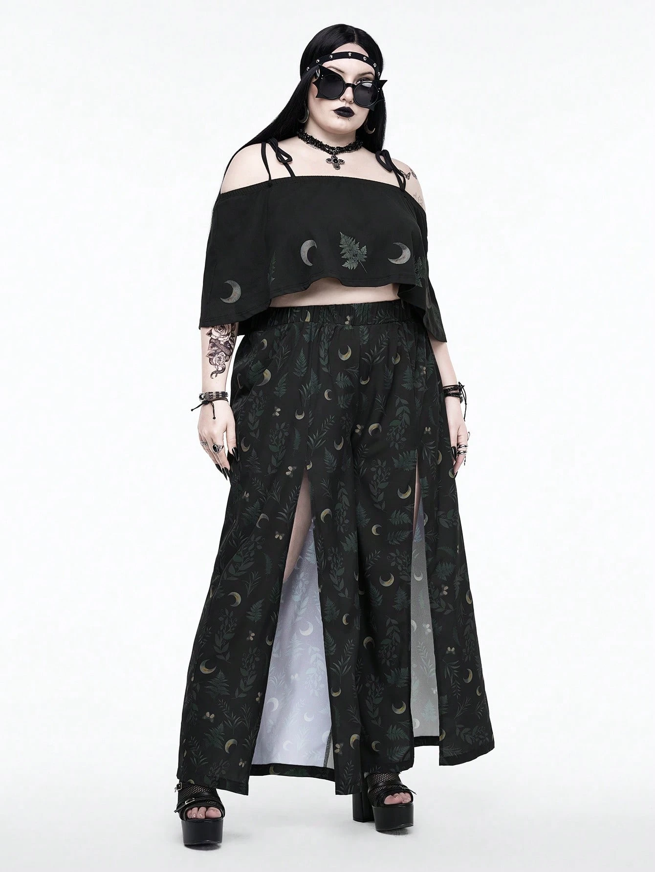 Goth Vacation Gothic Floral Print Plus Size Open Shoulder Tie-Strap Cropped Top + Wide-Leg Pants Set