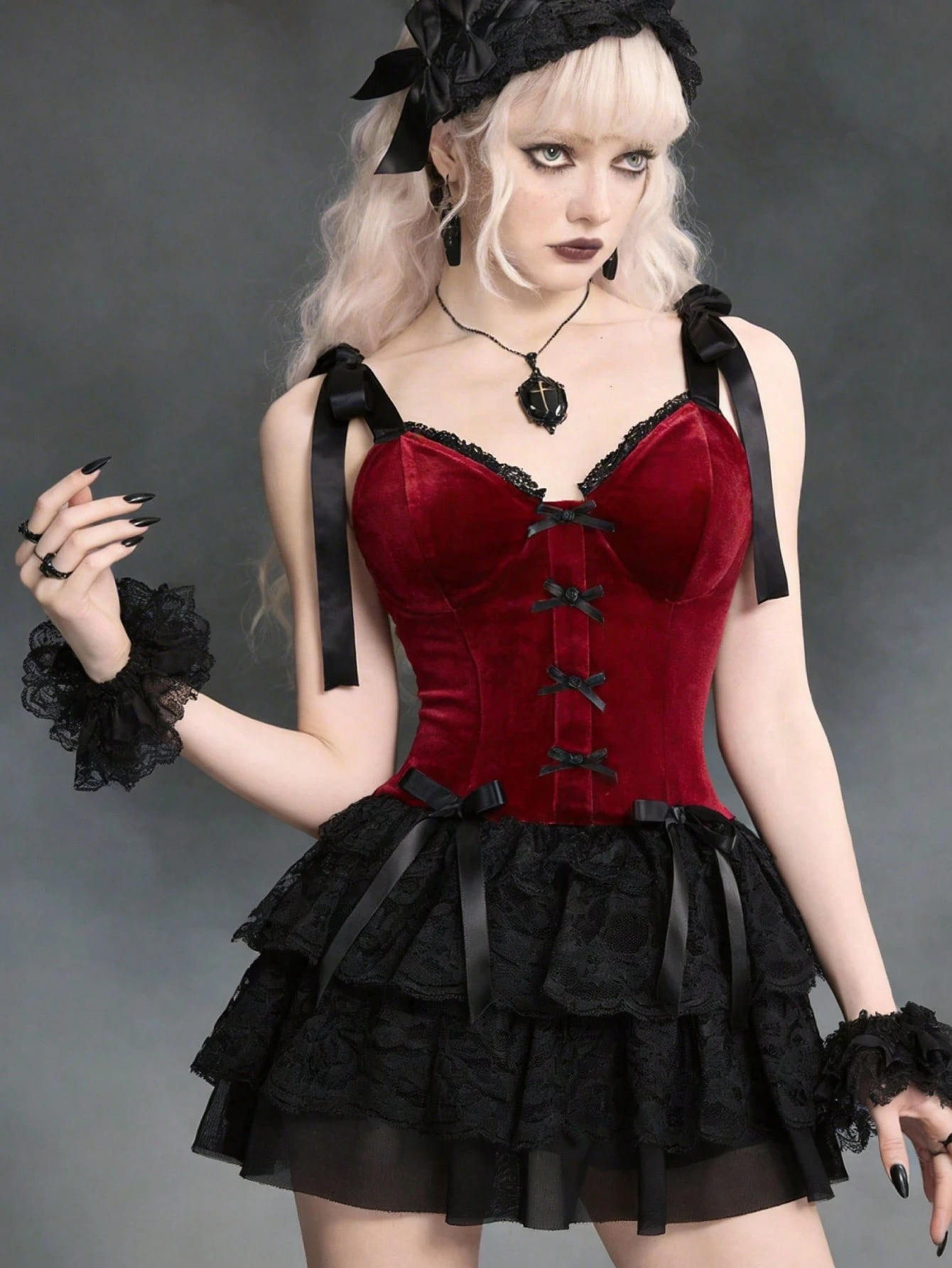 Valentine's Day Party Luxury Gothic Style Velvet & Contrast Lace Slip Dress