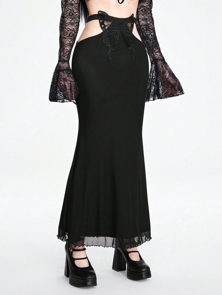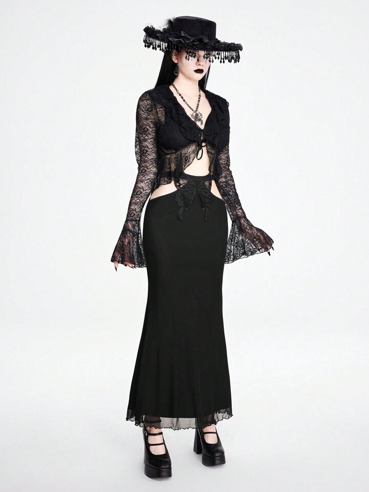 Vampire Dark Gothic Hollow Out Design Butterfly Applique Slim Fit Hip Hugging Mermaid Skirt For Women