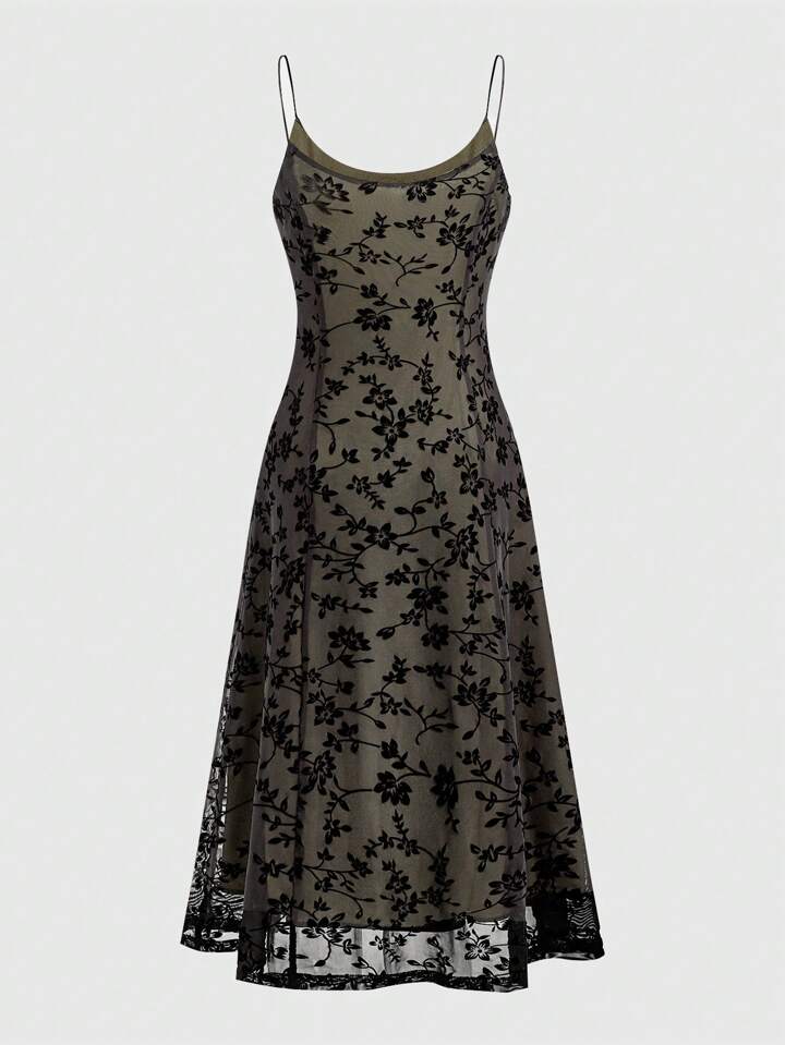 Victorian Gothic Style Flocked Floral Women's Spaghetti Strap A-Line Waist Cinched Dress