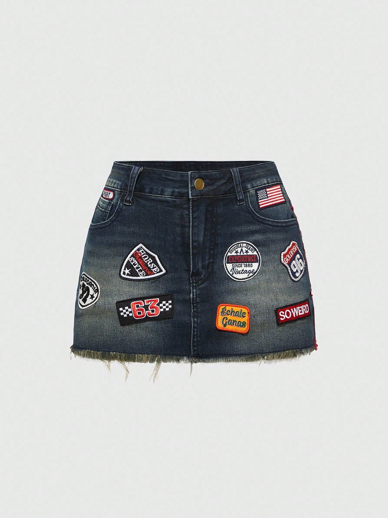 ROMWE Avant Vintage Distressed Retro Logo Denim Mini Skirt For Women
