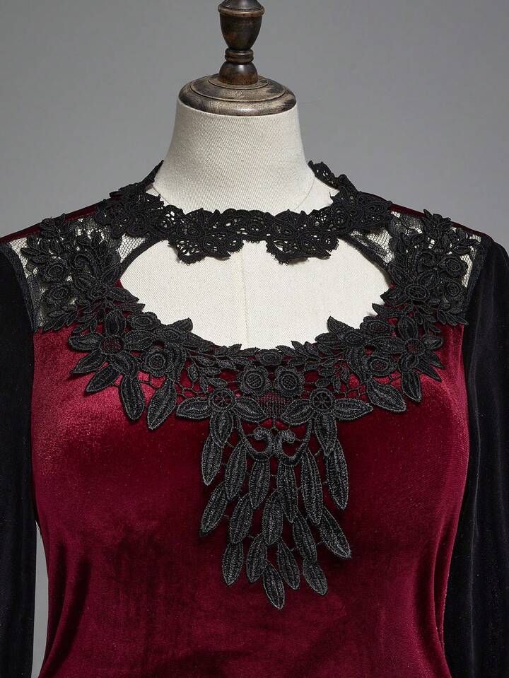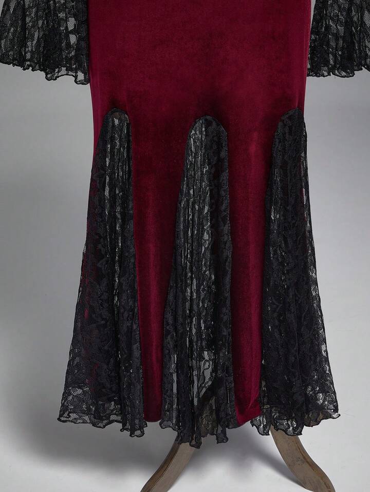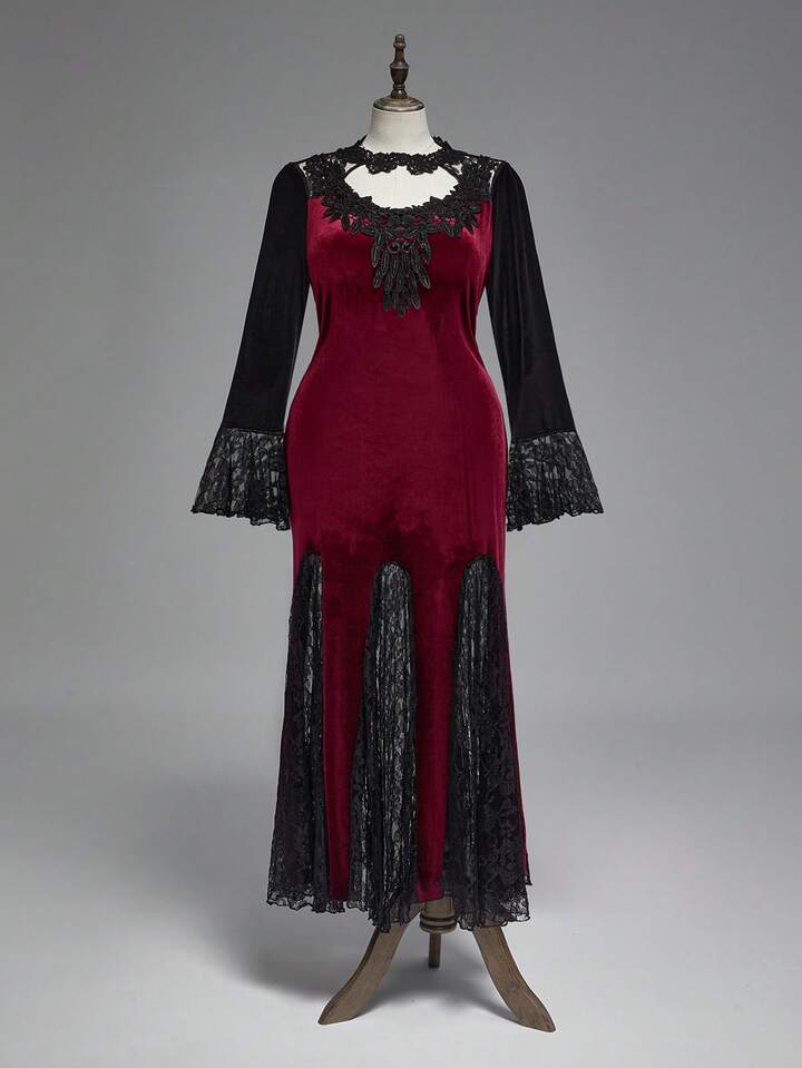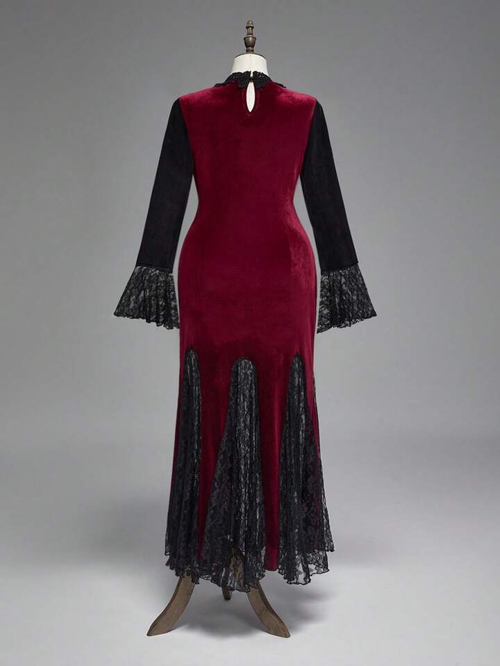 Vintage Elegant Gothic Collar Floral Lace Flare Sleeve Fishtail Hem Dress, Plus Size Autumn/Winter Banquet Formal Gown, Christmas Party Plus Size Luxurious Retro Velvet Red Dress