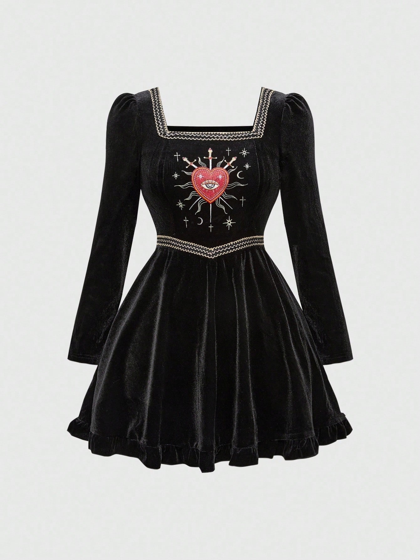Goth Vintage Gothic Dark Heart & Eye Embroidery Velvet Long Sleeve Dress, Halloween