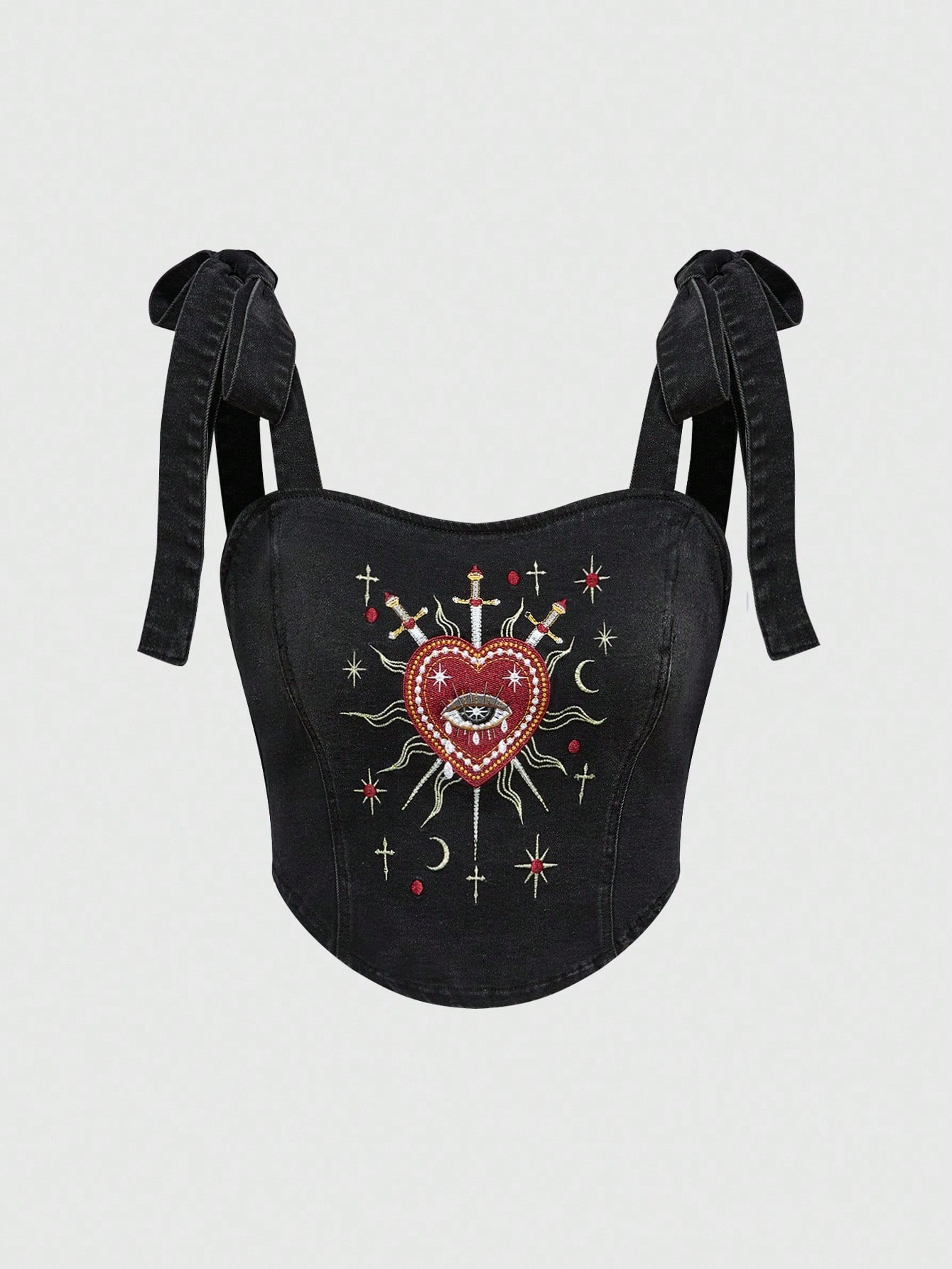 Goth Vintage Gothic Girl Mori Style Embroidered Heart, Rhinestone, Teardrop, Star Embellished Square Neck Black Lace-Up Denim Blouse For Women