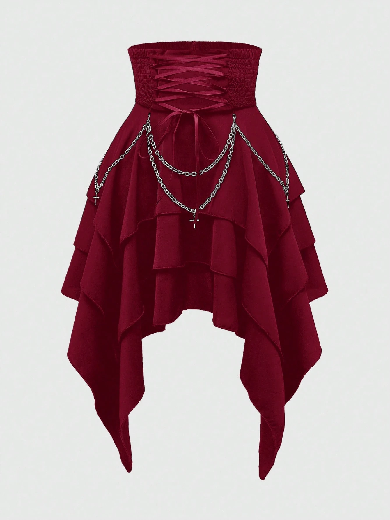 Goth Vintage Gothic High Waist Detachable Metal Chain Super High Waist Corset Belt Asymmetrical Multi-Layer Hem Women's Skirt, Halloween