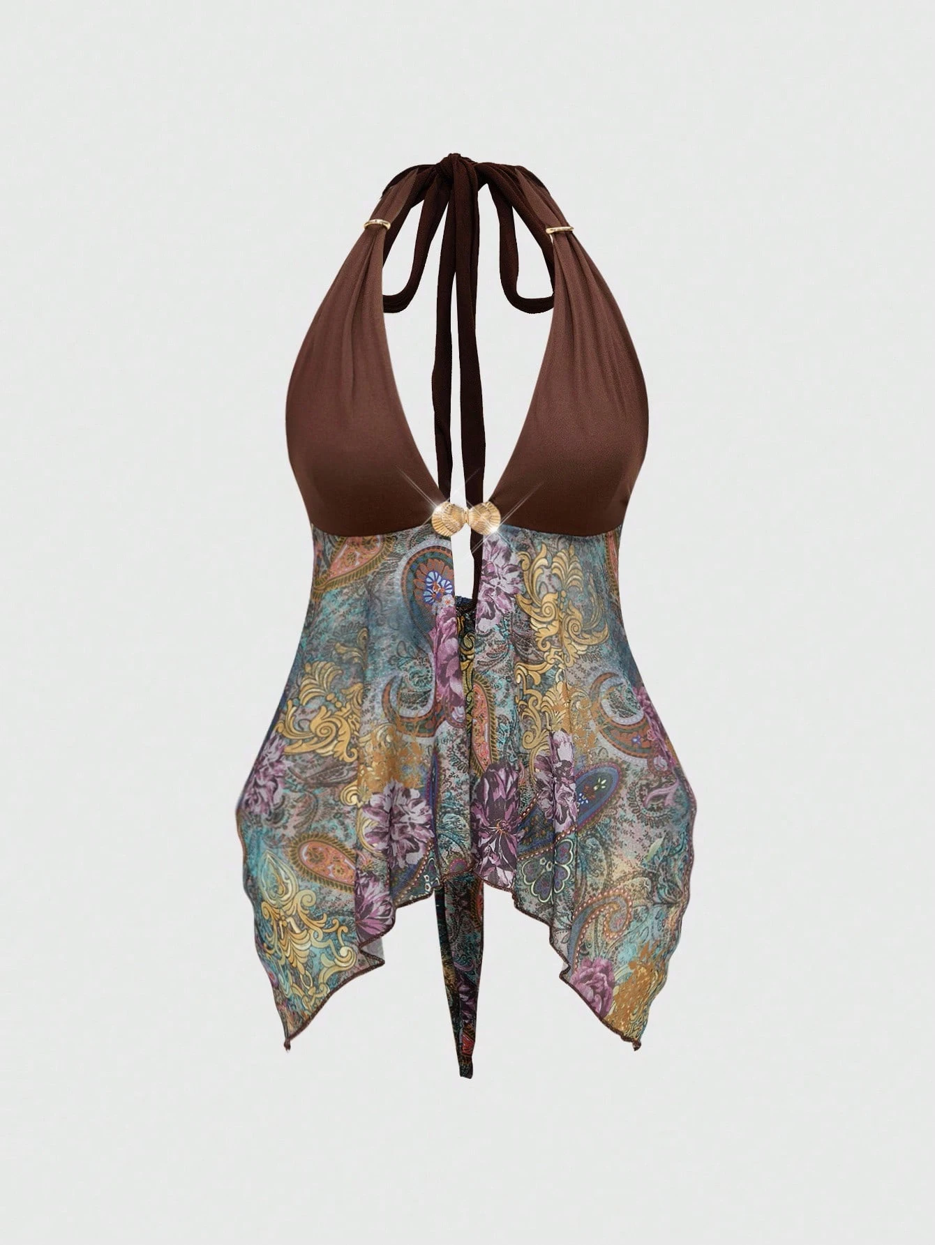 Hippie Vintage Hippie Western Metallic Chain Paisley Print Sexy Halter Neck Bodycon Asymmetric Hem Women Tank Top