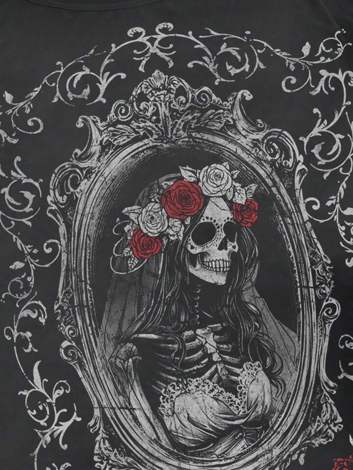 Vintage Skeleton Rose Goth Design Distressed Print Plus Size Loose Single Sleeve T-Shirt