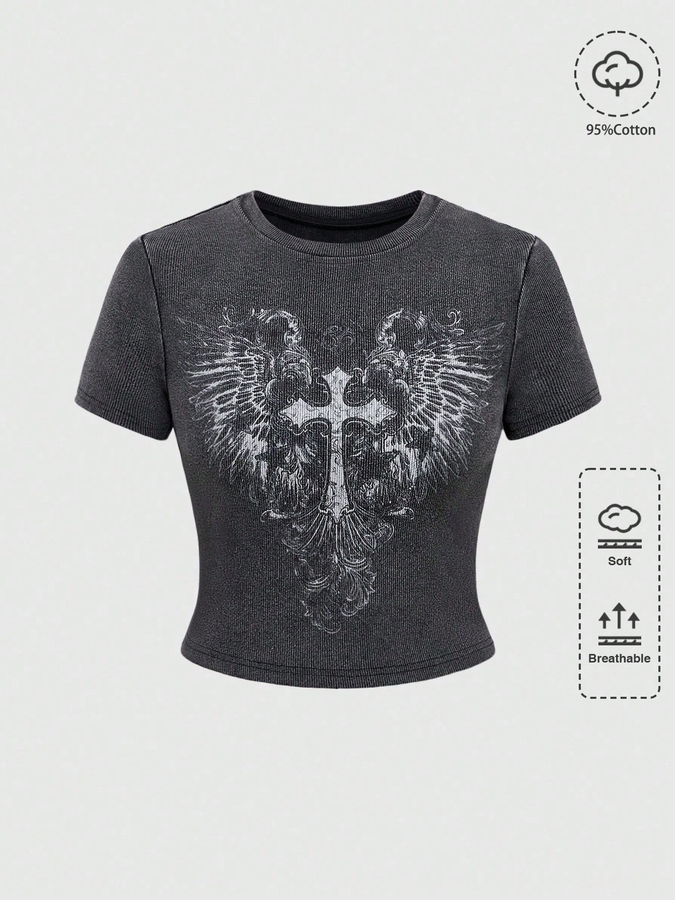 Grunge Punk Vintage Y2K Distressed Cross & Snowflake Graphic Slopped Shoulder Short Sleeve T-Shirt For Women, Music Festival Style