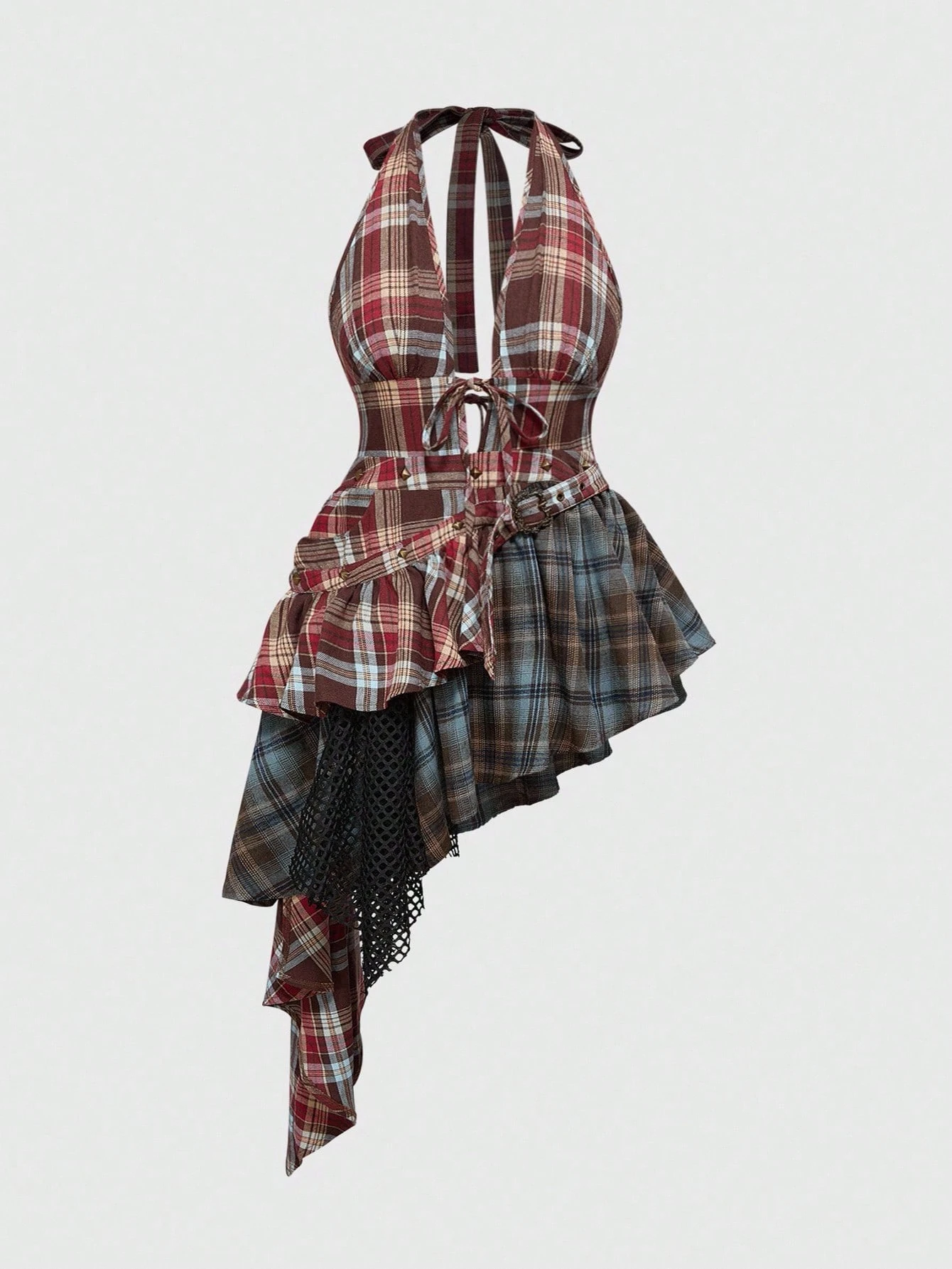 J-Fashion Vintage Y2K Patchwork Sleeveless Beach Concert Dress For Women, With Studds, Rhinestones, Lace, Mesh, Asymmetrical Hemline, Low Waist, Plus Size, For Summer, Vacation, Music Festivals, Red, Blue