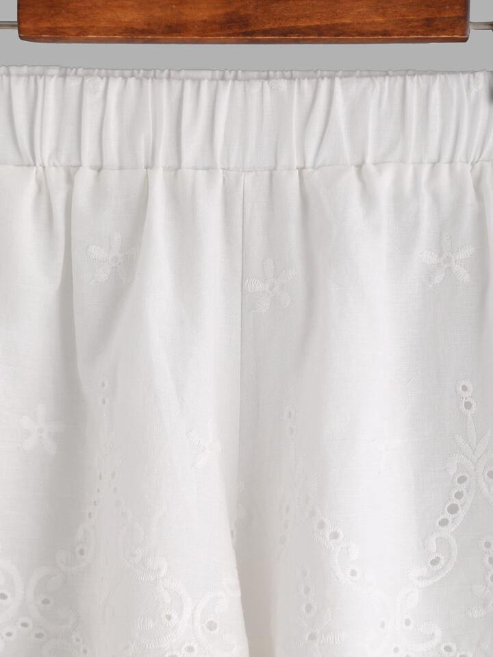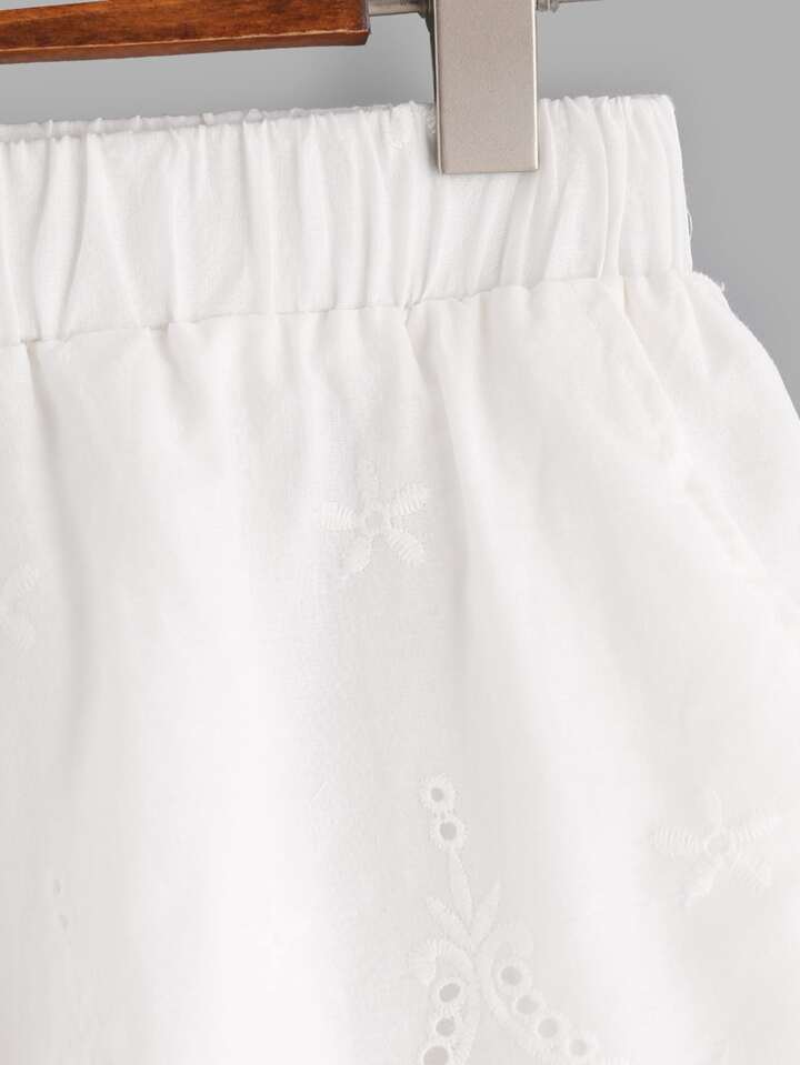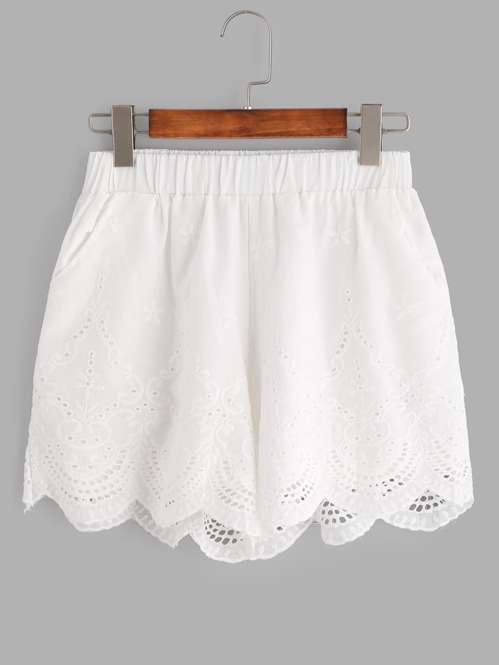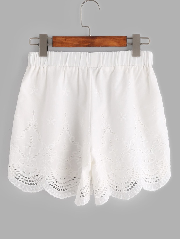 White Flower Embroidered Eyelet Scallop Hem Shorts