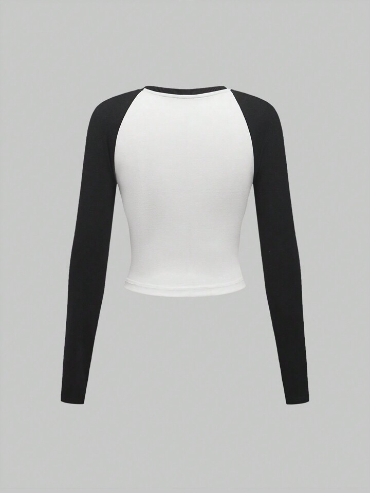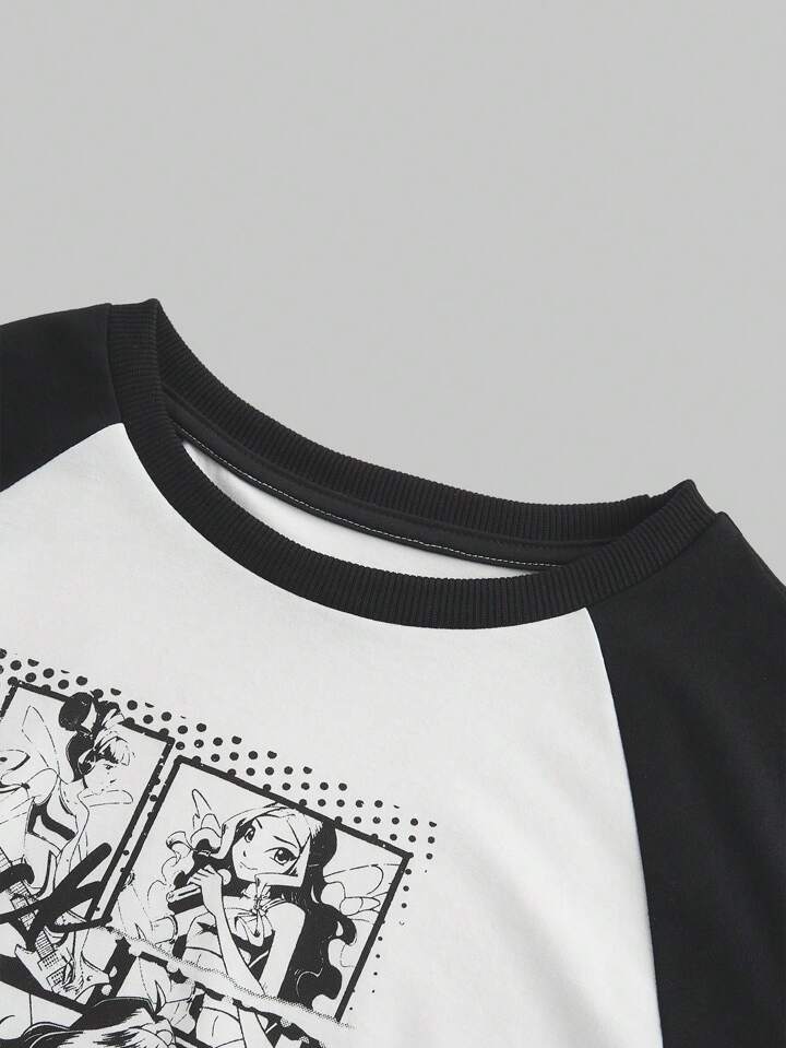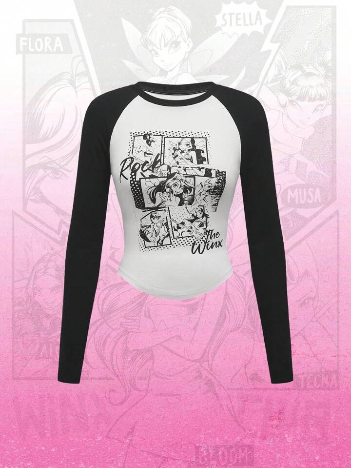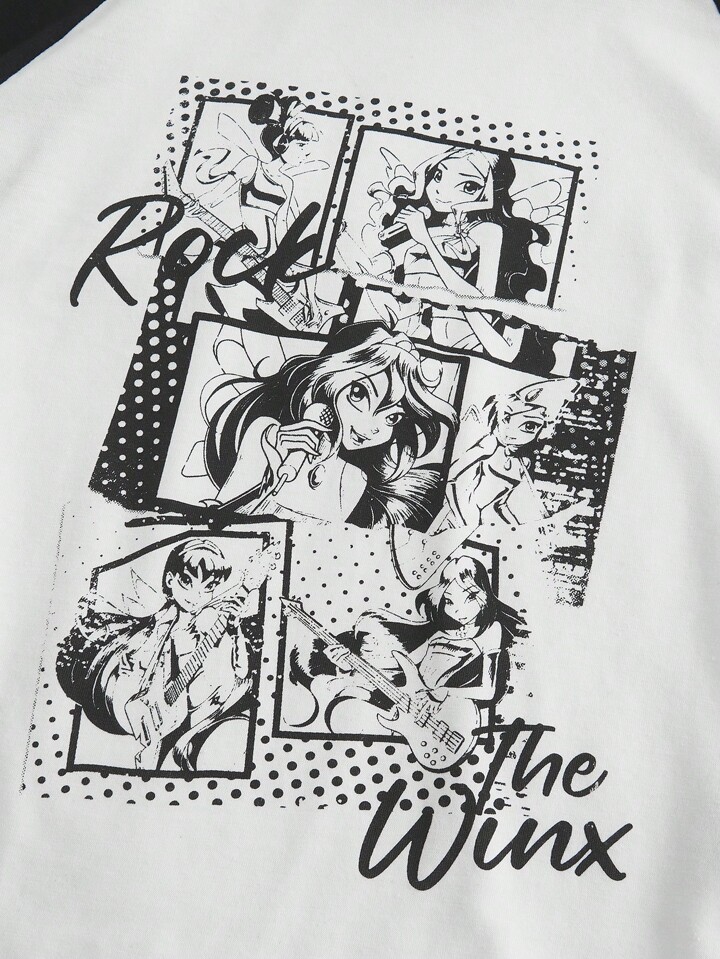 Winx Club X ROMWE Women's Contrast Color Black & White Cartoon Print Raglan Sleeve Fitted Short Tee