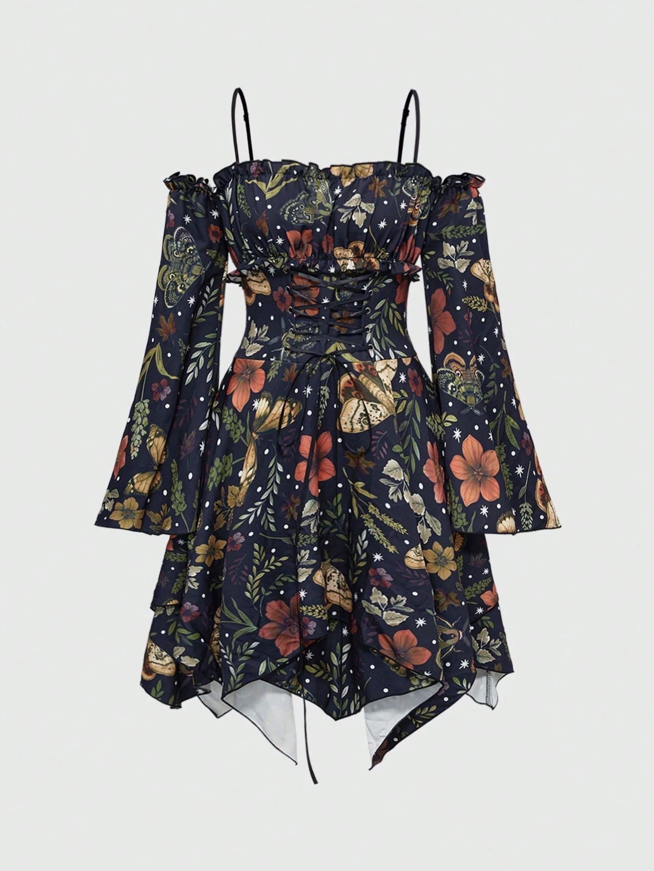 Fairycore Women's Casual Floral Print Cross-Tie Flare Sleeve Dress, Autumn
