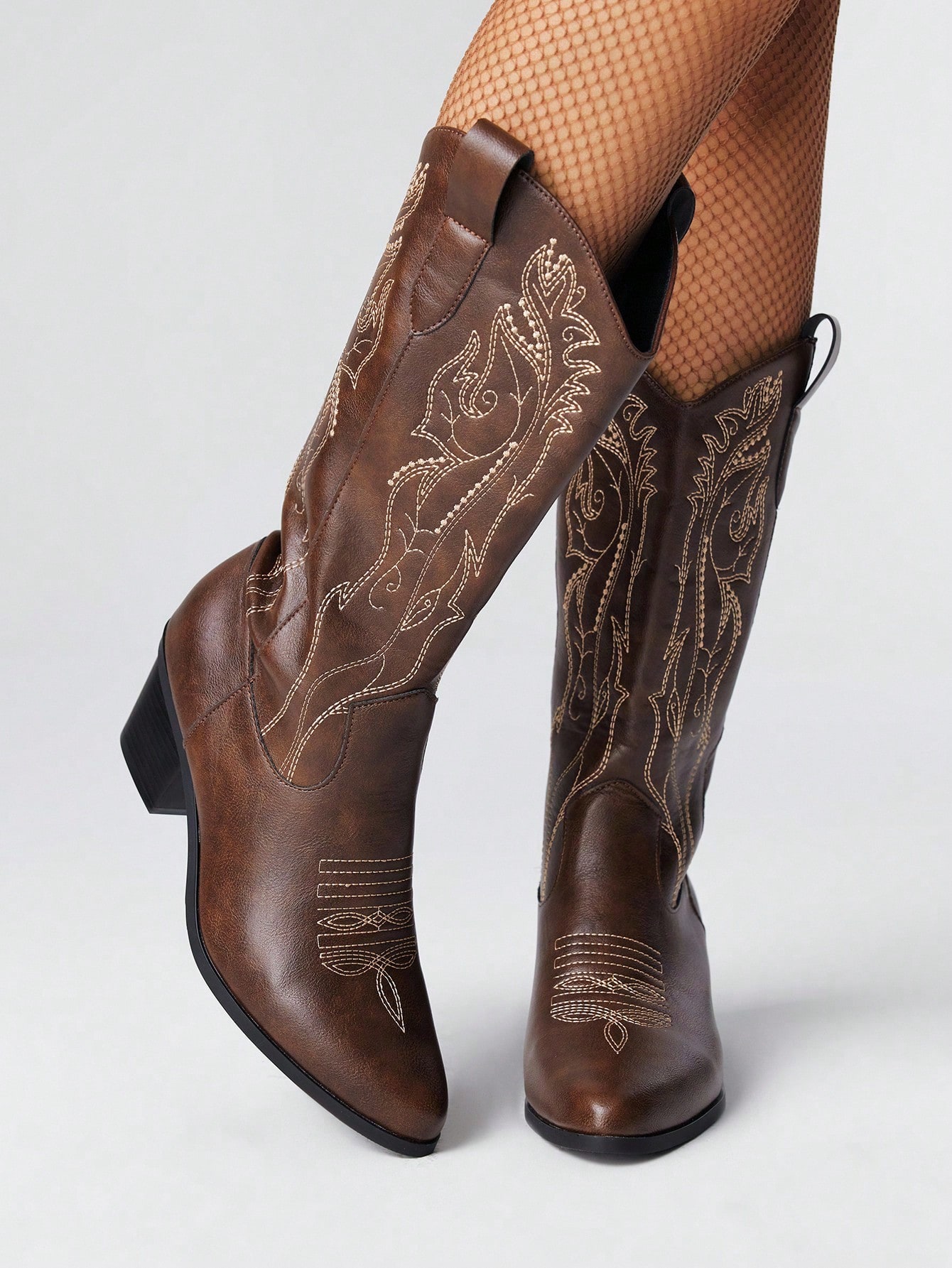 Fairycore Women's Cowboy Boots, New Spring/Autumn Mori Style Brown Pointed Toe Embroidered Western Boots