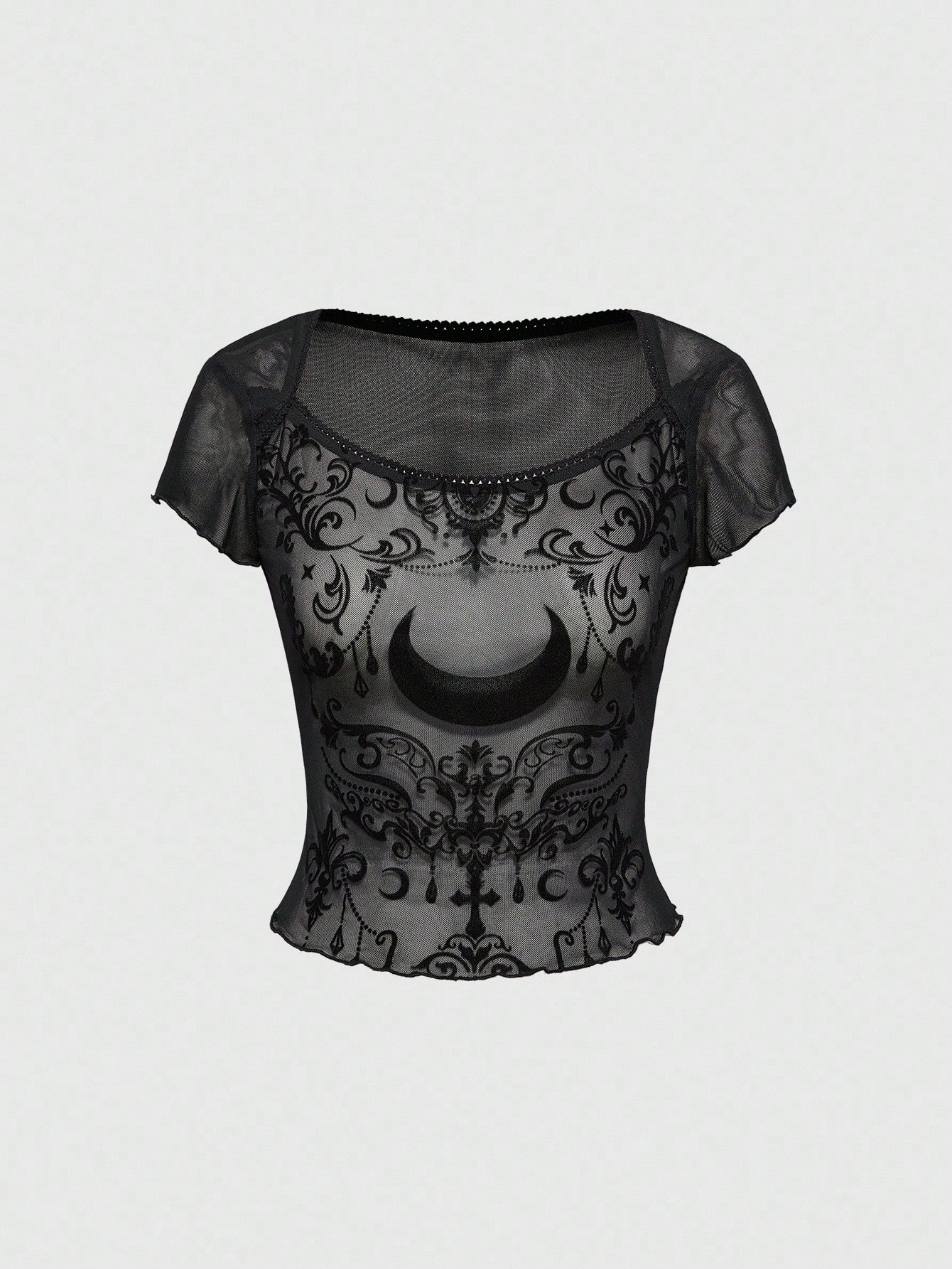 ROMWE Avant Women's Moon Flocked Sheer Mesh Short Sleeve Fashionable Blouse, Halloween
